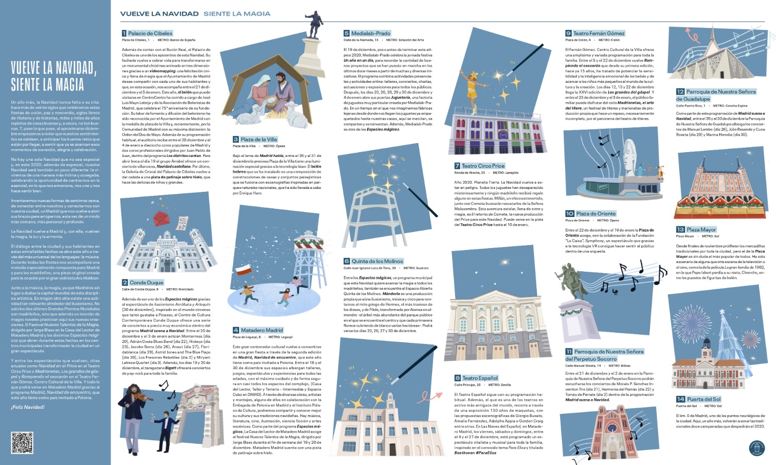 La magia, la luz y la armonía nos acompañan en esta Navidad diferente de #CulturaSegura. El diálogo entre la ciudad y sus habitantes se abre a través del más universal de los lenguajes: la música. Durante estas fiestas nos acompañará una melodía especialmente compuesta para Madrid y para los madrileños, una pieza original creada para la ocasión por el gran violinista Ara Malikian, cuya figura se localiza en el mapa.