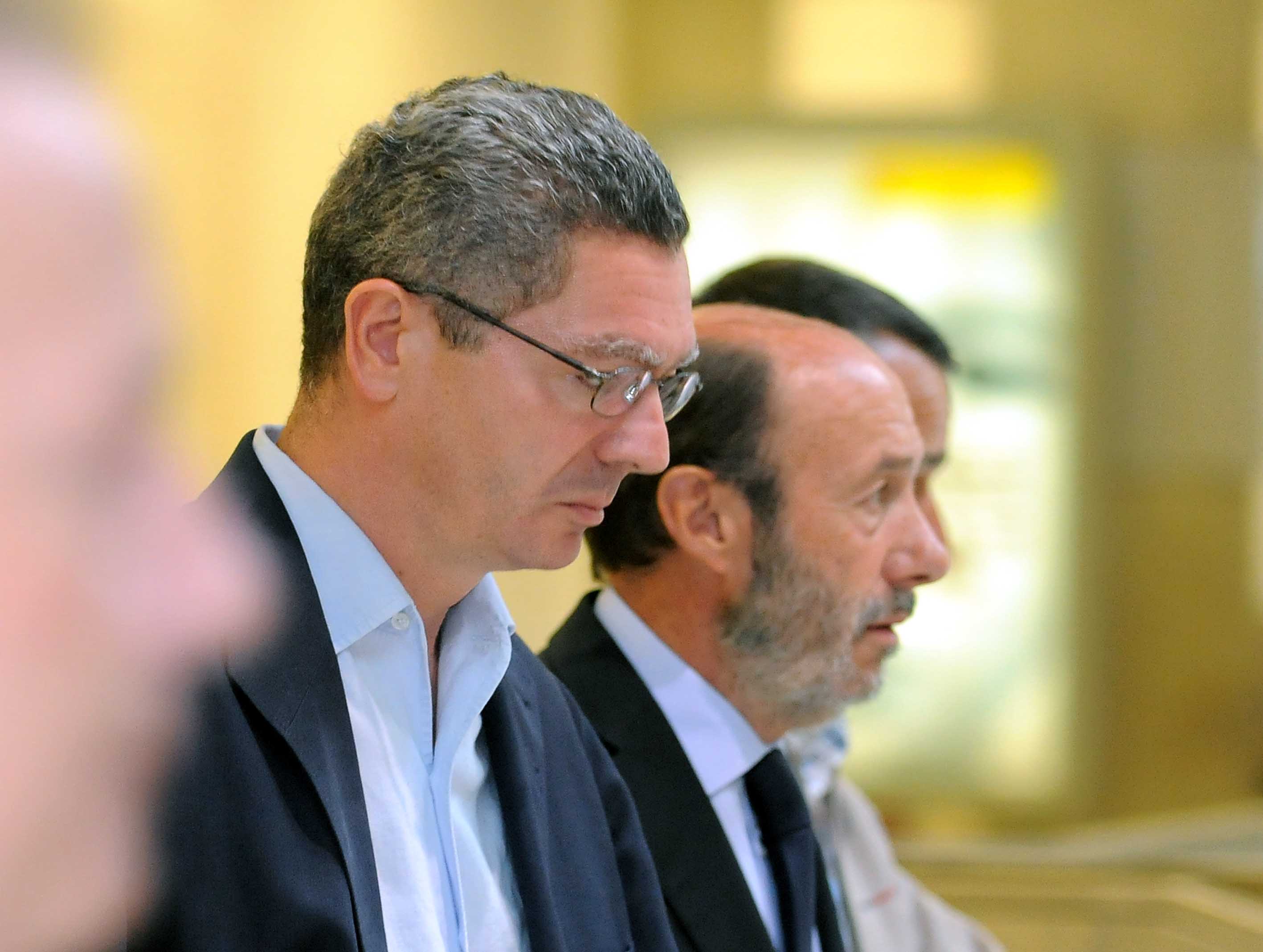 El alcalde de Madrid, Alberto Ruiz-Gallardón, junto al ministro del Interior, Alfredo Pérez Rubalcaba, en el aeropuerto de Barajas, tras el accidente ocurrido esta tarde.