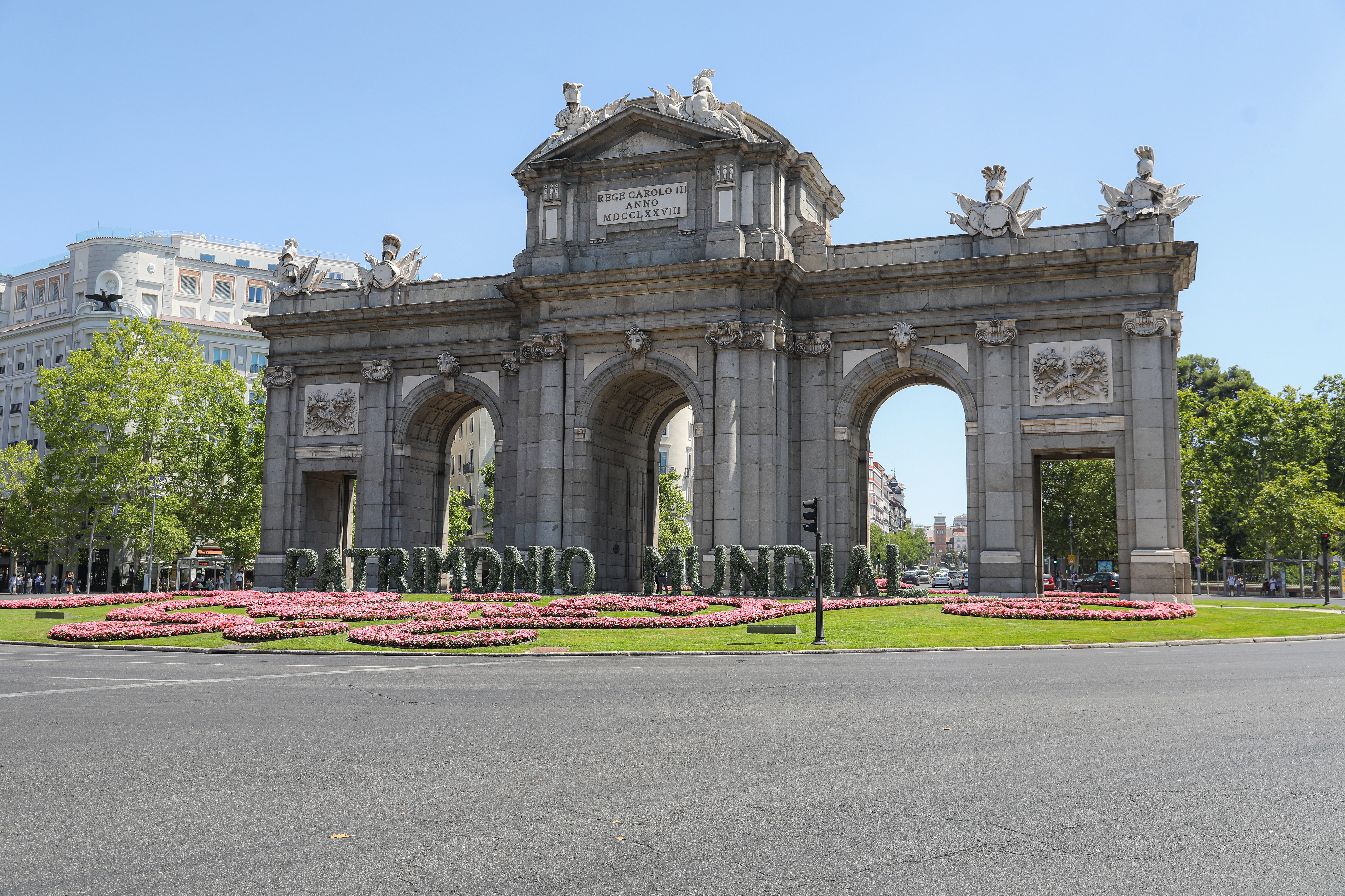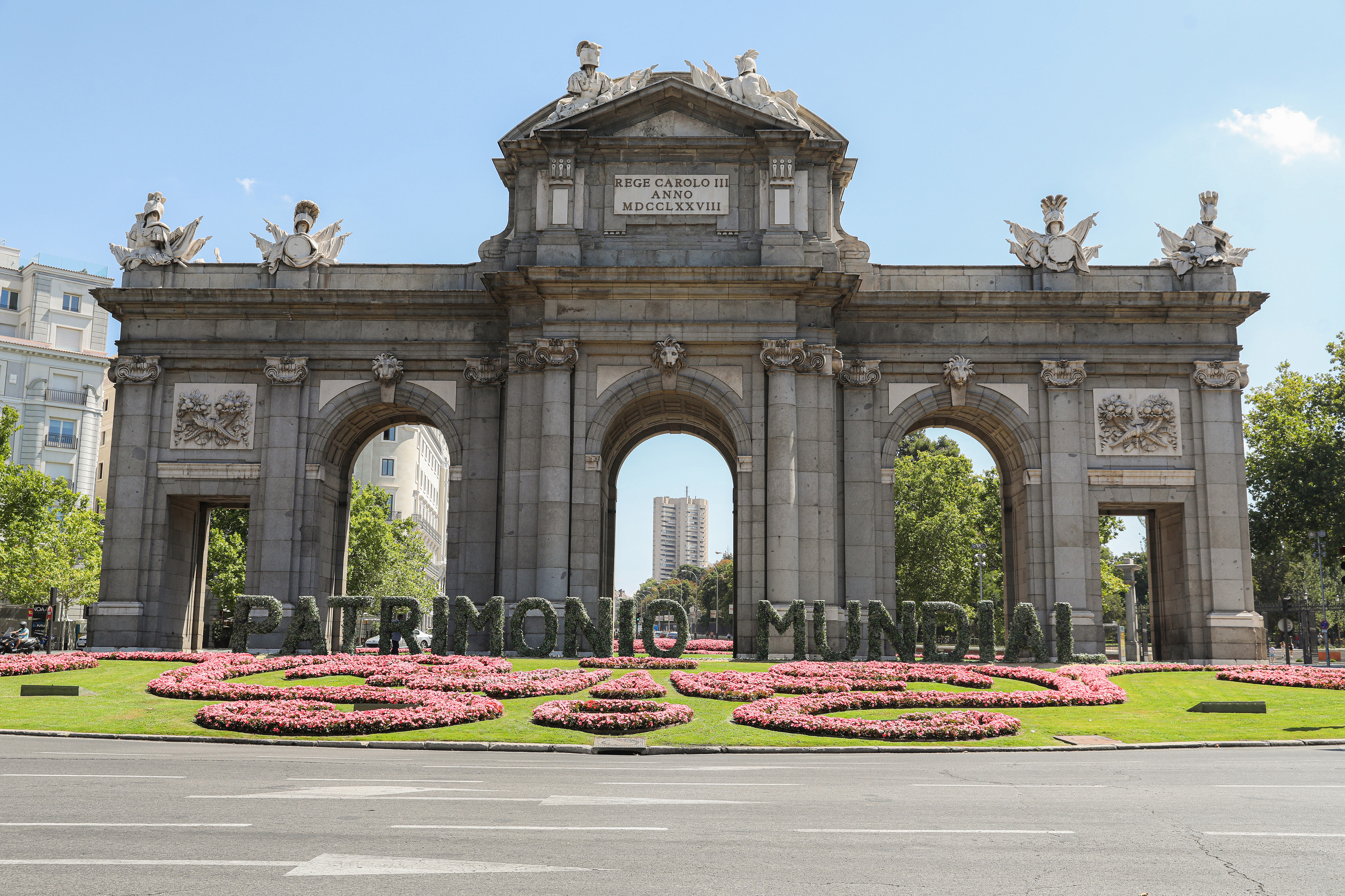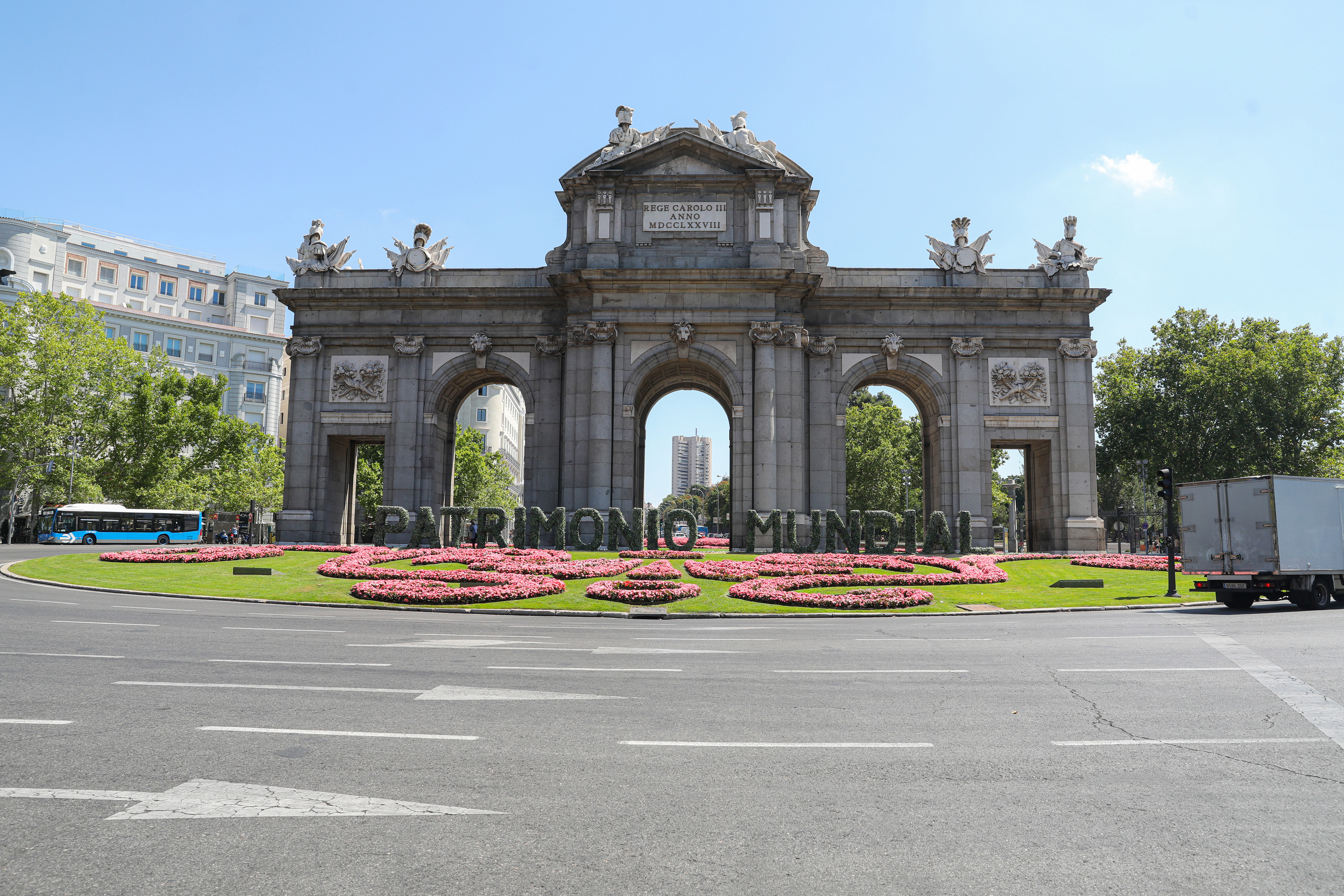 El Ayuntamiento de Madrid ha instalado en la Puerta de Alcalá unas letras de 35 metros de longitud, recubiertas de hojas, donde puede leerse el mensaje ‘Patrimonio Mundial’. Se trata de una iniciativa del Gobierno municipal para homenajear la reciente declaración por parte de la UNESCO como Patrimonio Mundial del Paisaje de la Luz, integrado por el paseo del Prado y El Buen Retiro.