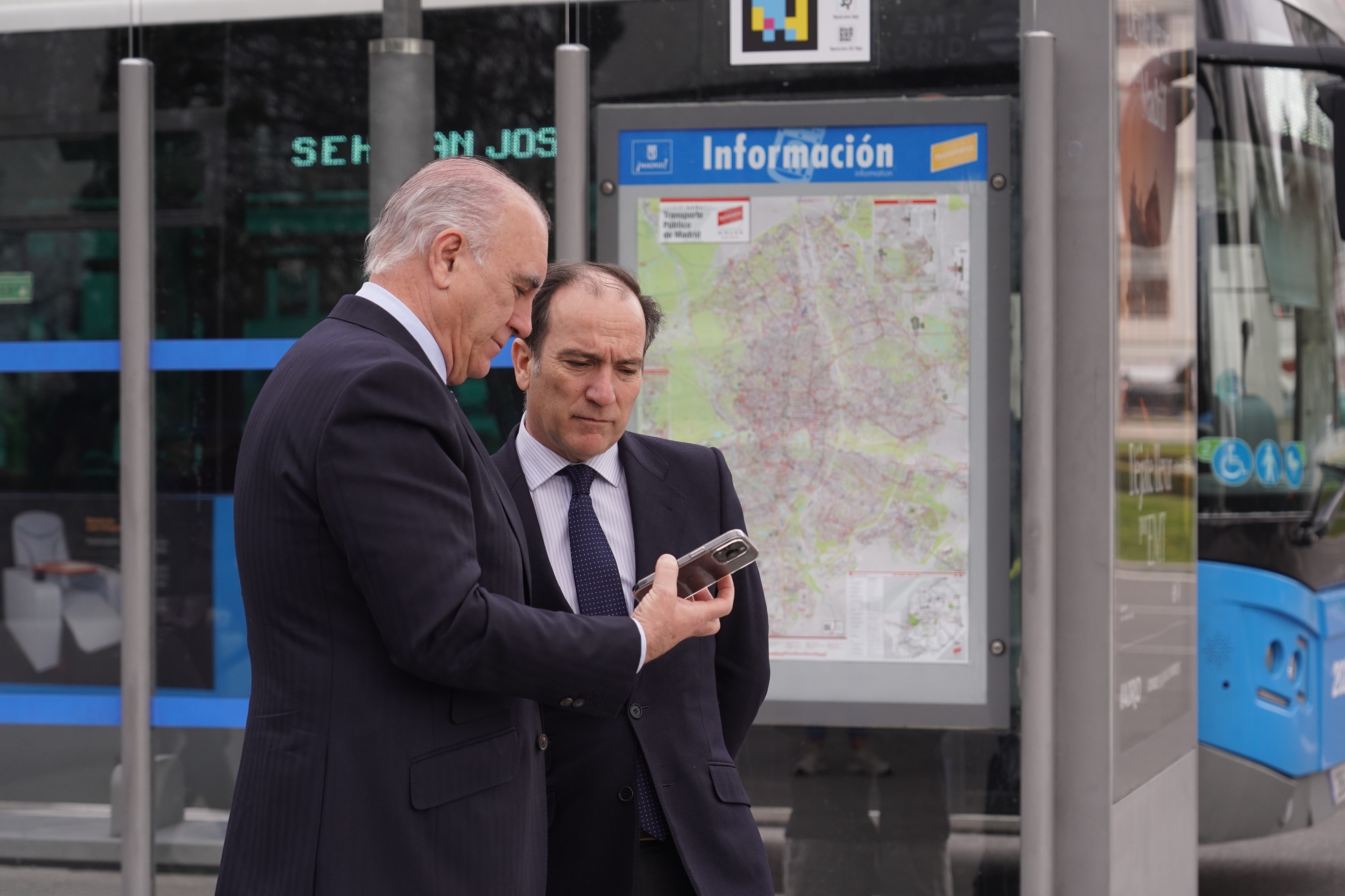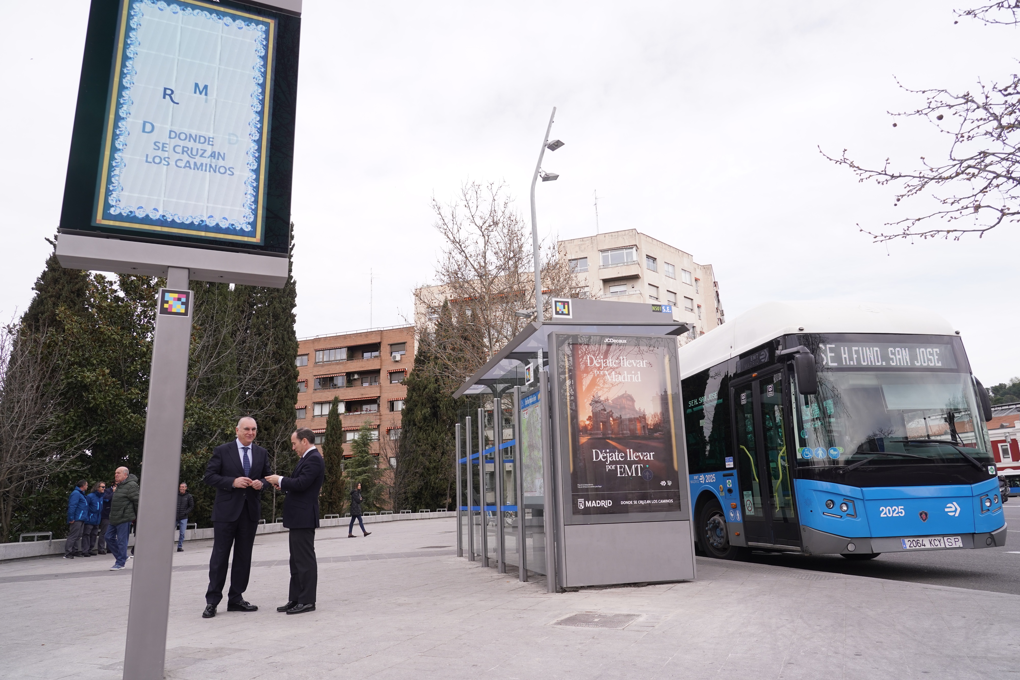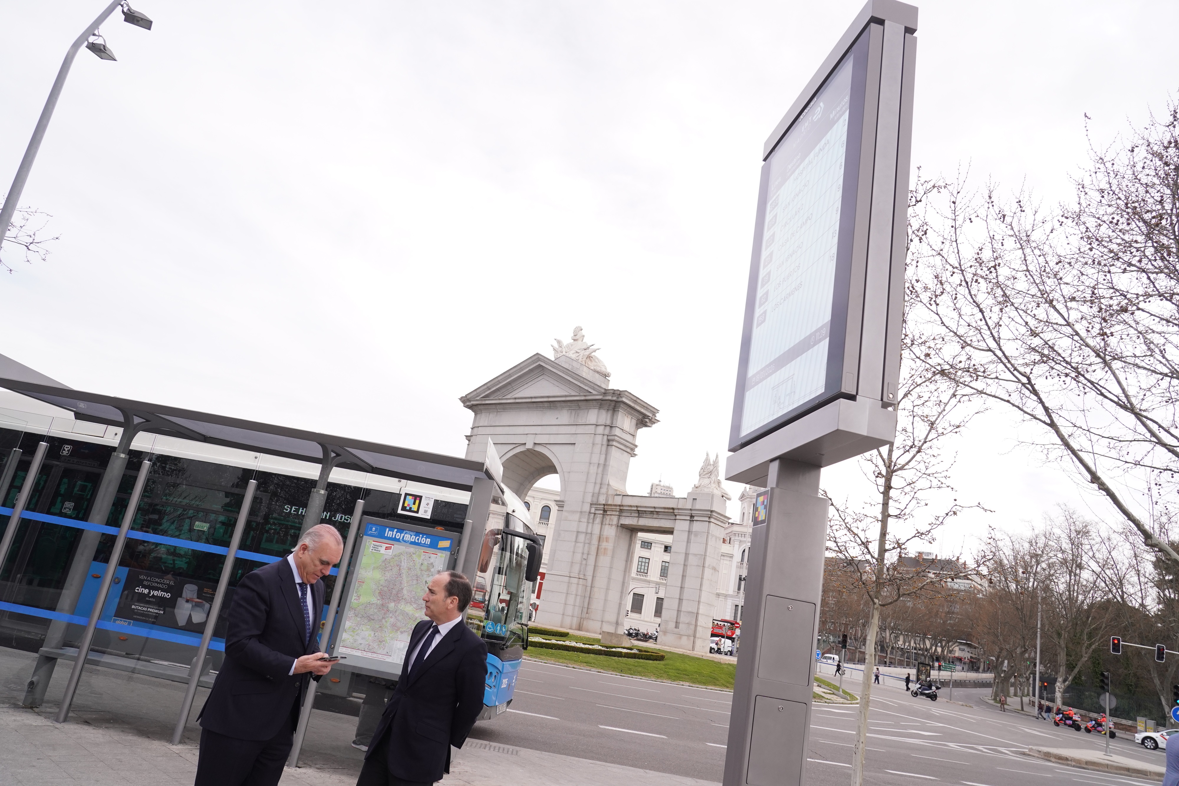 La Empresa Municipal de Transportes de Madrid (EMT Madrid) ha comenzado la sustitución de sus paneles informativos de matriz de puntos por pantallas digitales de gran formato que podrán reproducir vídeos. Los llamados paneles de mensajería variable o PMV emblemáticos se renuevan con el objetivo de mejorar la experiencia informativa que reciben los usuarios de EMT Madrid en ubicaciones que destacan por su interés turístico, cultural o urbanístico. El delegado de Urbanismo, Medio Ambiente y Movilidad, Borja Carabante, ha presentado los nuevos paneles en la glorieta de San Vicente.