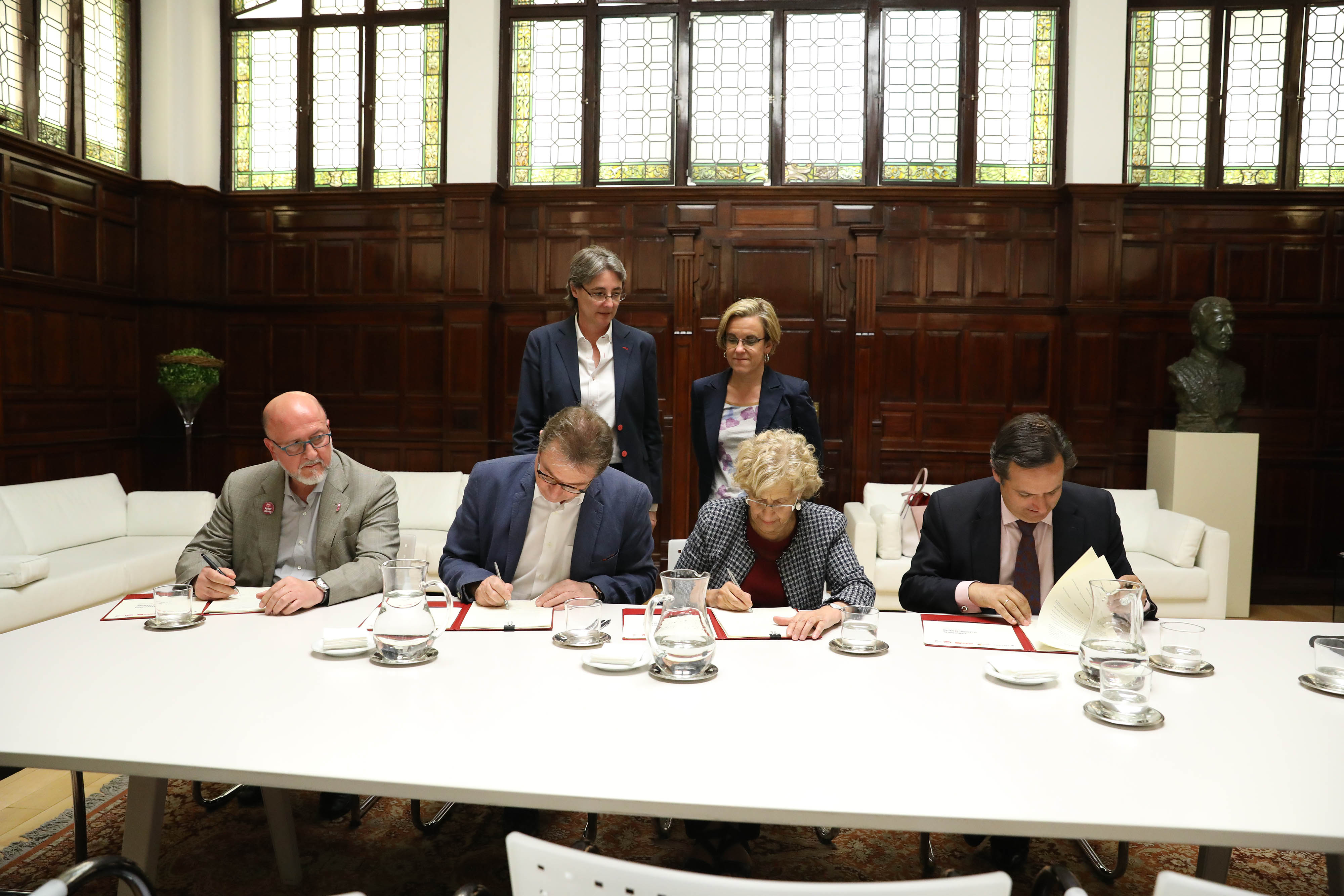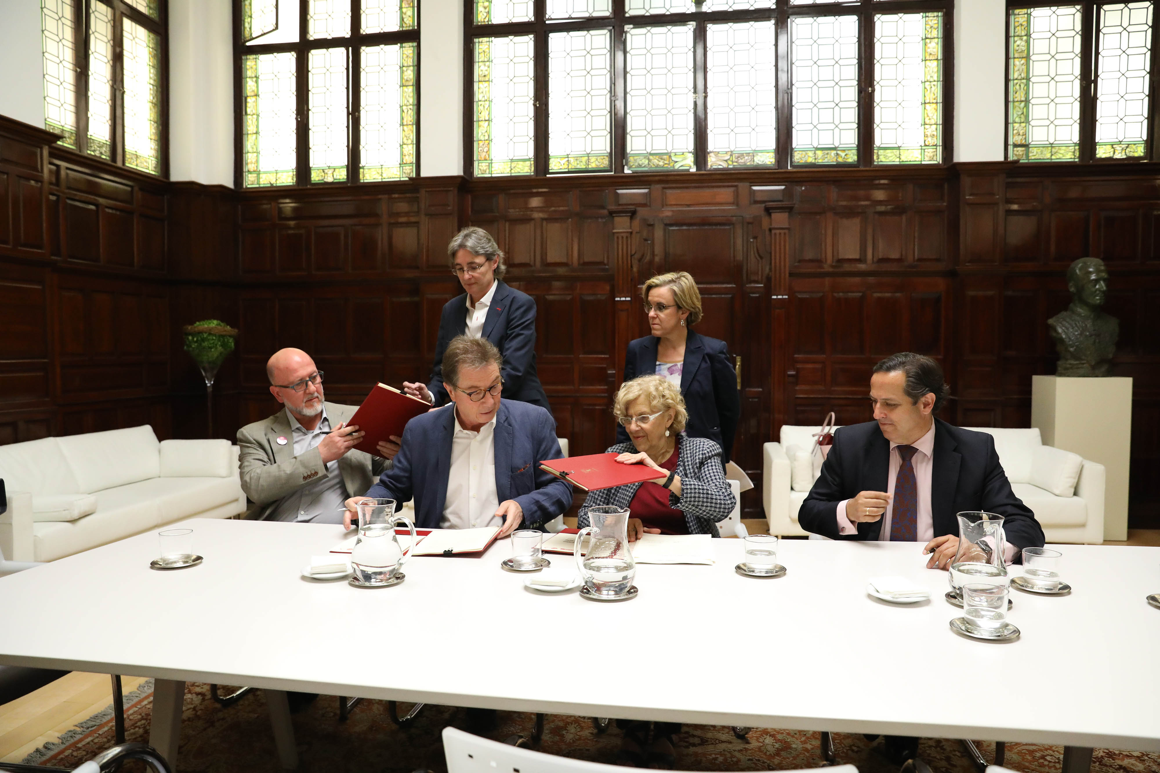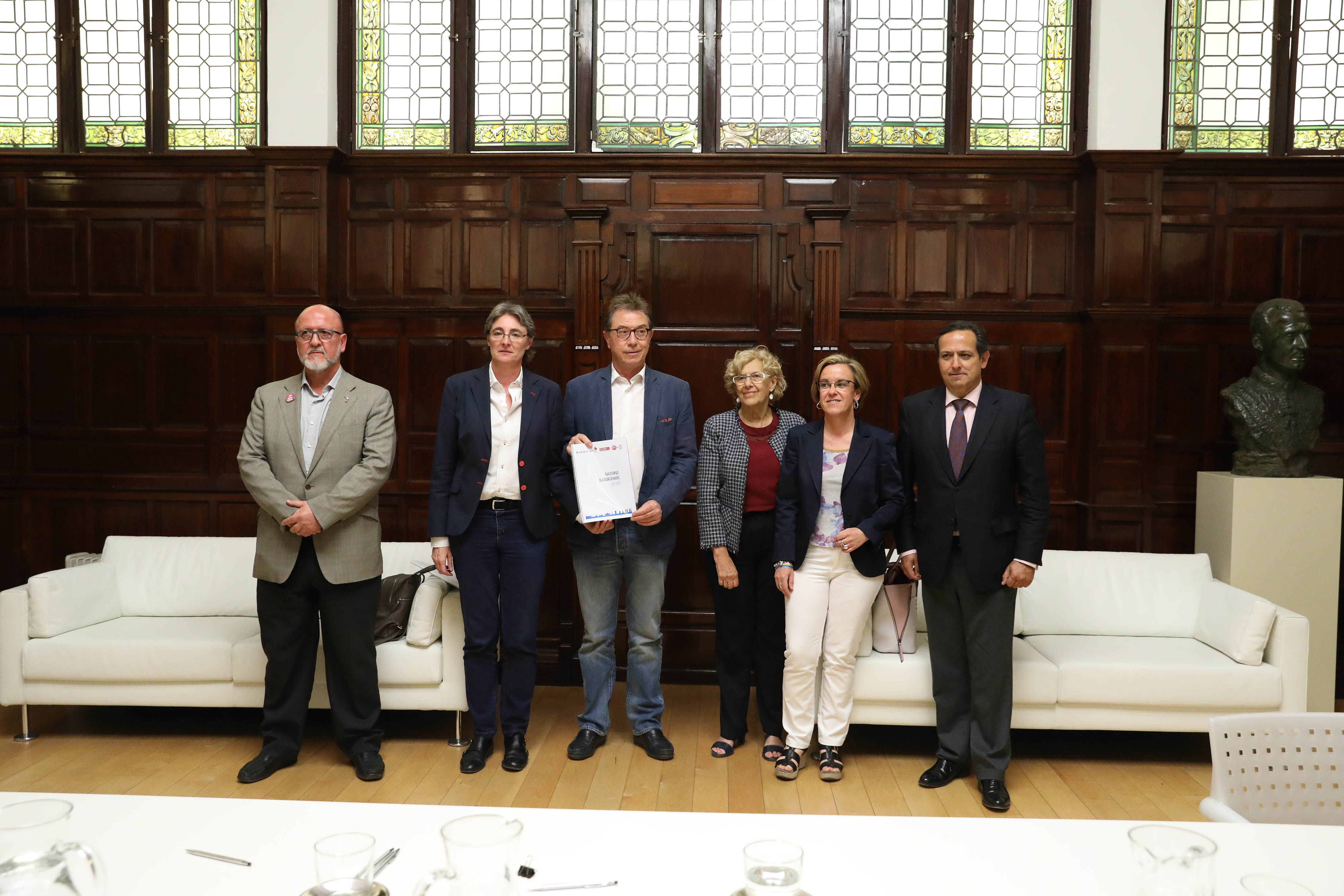 La alcaldesa de Madrid, Manuela Carmena; la delegada del Área de Equidad, Derechos Sociales y Empleo, Marta Higueras; la portavoz del Grupo municipal Socialista, Purificación Causapié, el secretario general de UGT Madrid, Luís Miguel López Reillo; el secretario general de CCOO Madrid, Jaime Cedrún; y el presidente de CEIM (Confederación Empresarial de Madrid-CEOE), Juan Pablo Lázaro, han firmado hoy miércoles, 17 de mayo, el “Plan de Empleo de la ciudad de Madrid 2017-2019”.