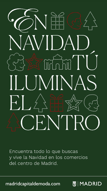 ‘En Navidad, tú iluminas el Centro’ invita a madrileños y turistas a disfrutar de la oferta comercial y de ocio del centro de Madrid, así como de su espectacular decoración navideña. Esta campaña estará presente también en más de 300 mupis digitales instalados en el mobiliario urbano del 2 al 31 de diciembre y en el vinilado exterior de los autobuses de la EMT del 25 de noviembre al 8 de diciembre.