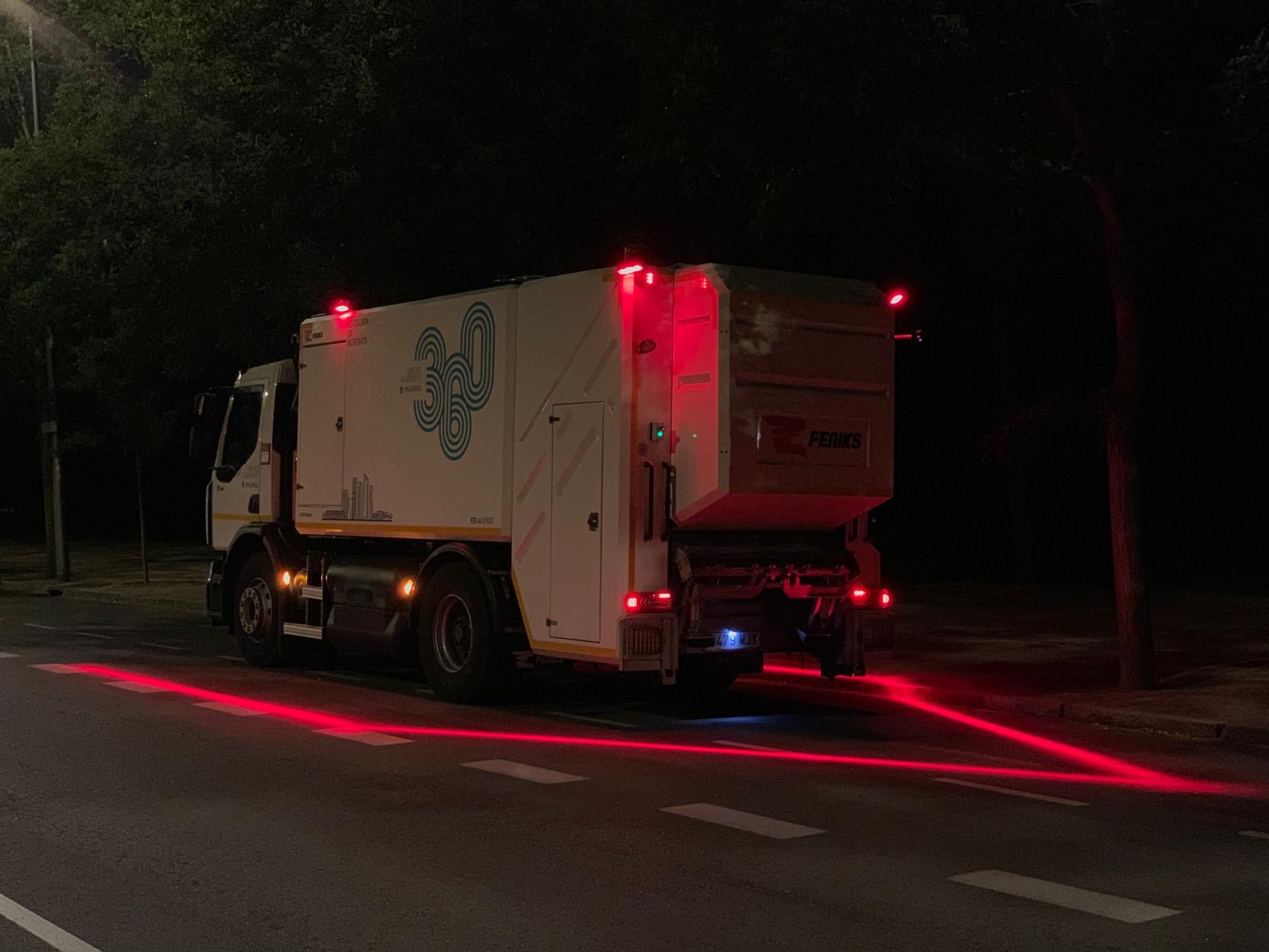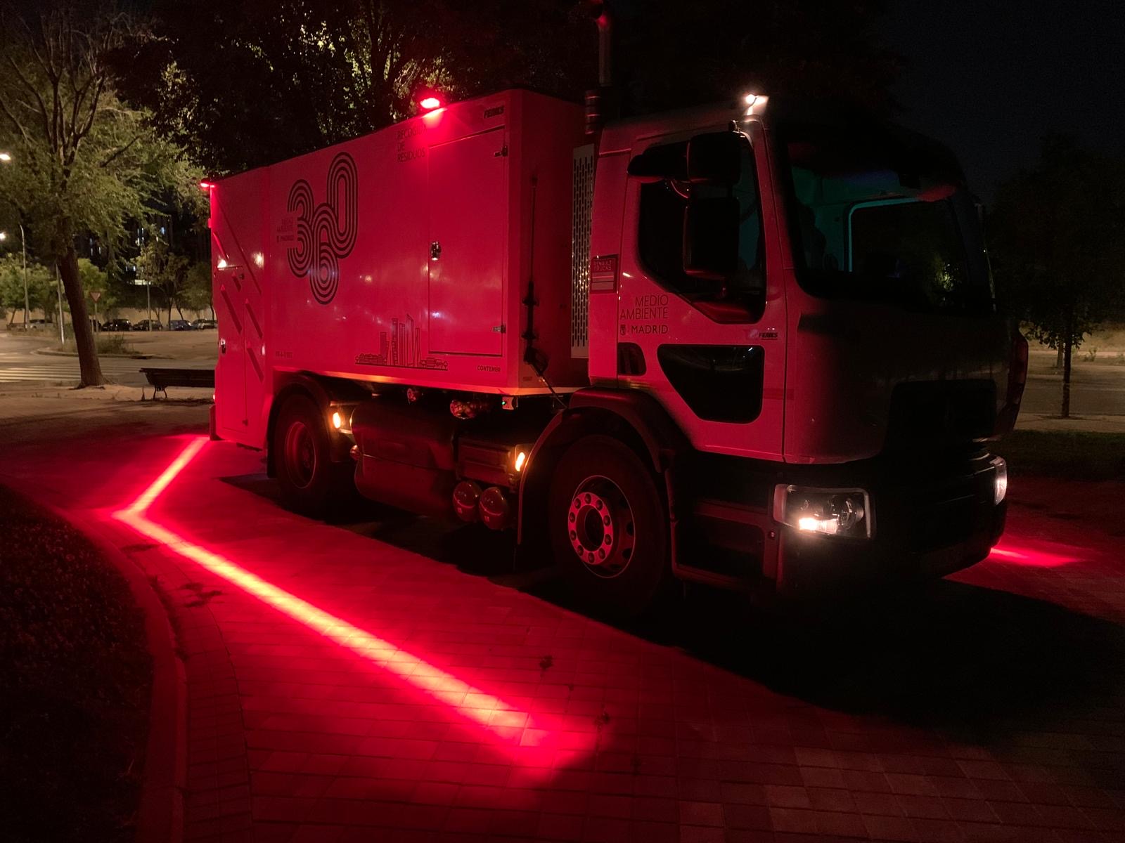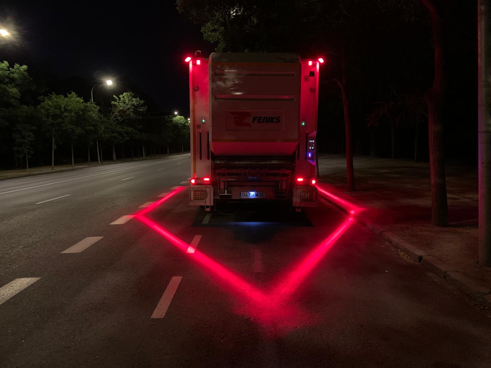 La nueva iluminación consiste en proyectar sobre el suelo un haz de luz que delimita el área de trabajo de los operarios, que no debe ser rebasado por el resto de los vehículos que circulan por los viales ni por los peatones, mejorando sustancialmente la seguridad de los trabajadores, especialmente en el turno de noche o en condiciones de poca visibilidad.