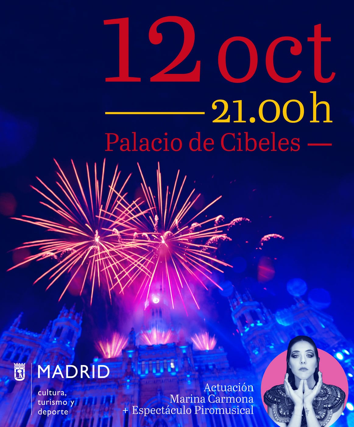 El Ayuntamiento de Madrid ofrecerá el Día de la Hispanidad, el próximo 12 de octubre, un espectáculo de música y pirotecnia en la plaza de Cibeles, organizado por el Área de Cultura, Turismo y Deporte, que dirige Andrea Levy. A las 21:00 h la música comenzará a sonar en el entorno del Palacio de Cibeles, donde la cantante Marina Carmona, interpretará canciones propias y versiones de temas míticos como Vente pa´ Madrid, compuesto por su padre, Antonio Carmona, líder del grupo Ketama.