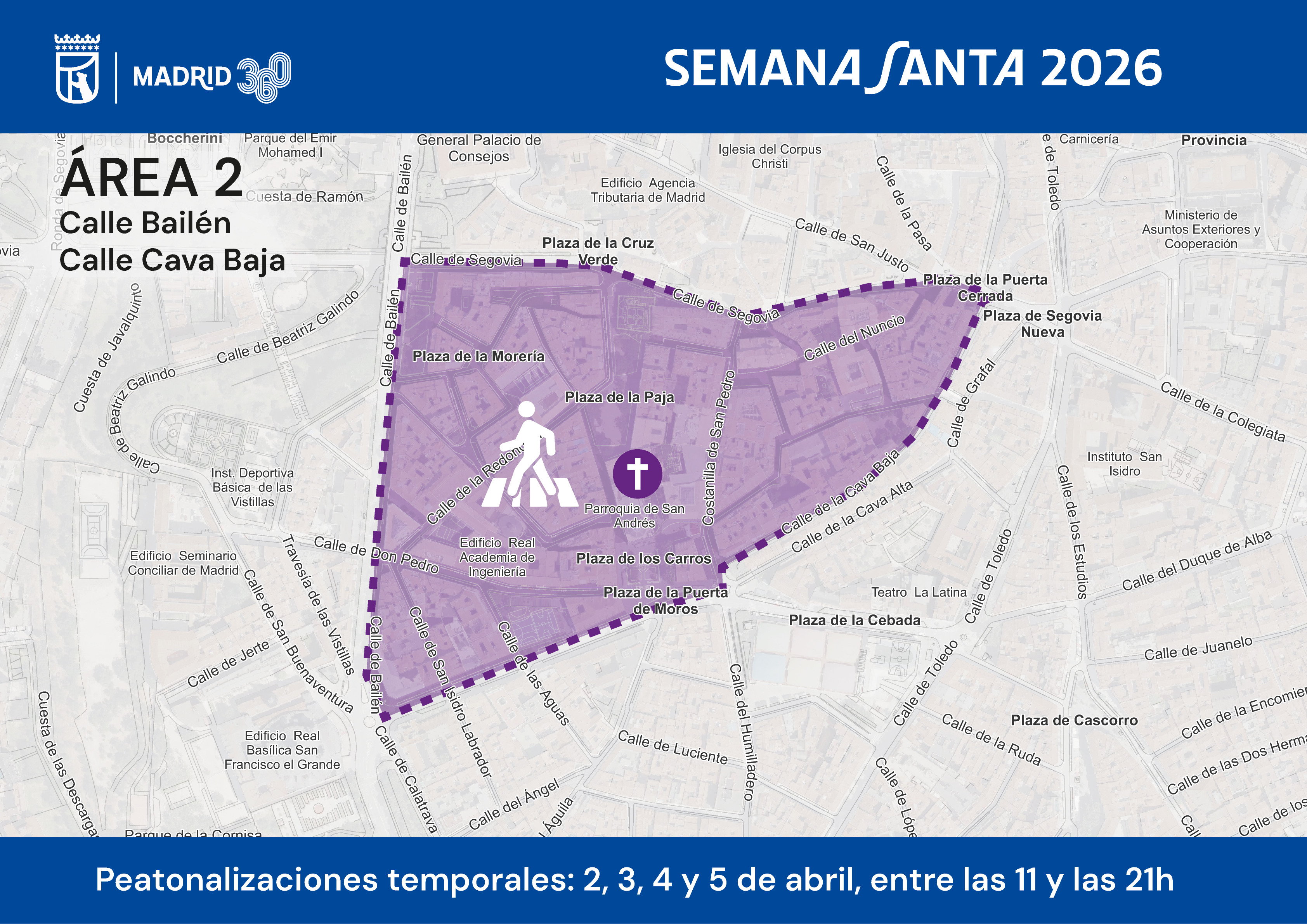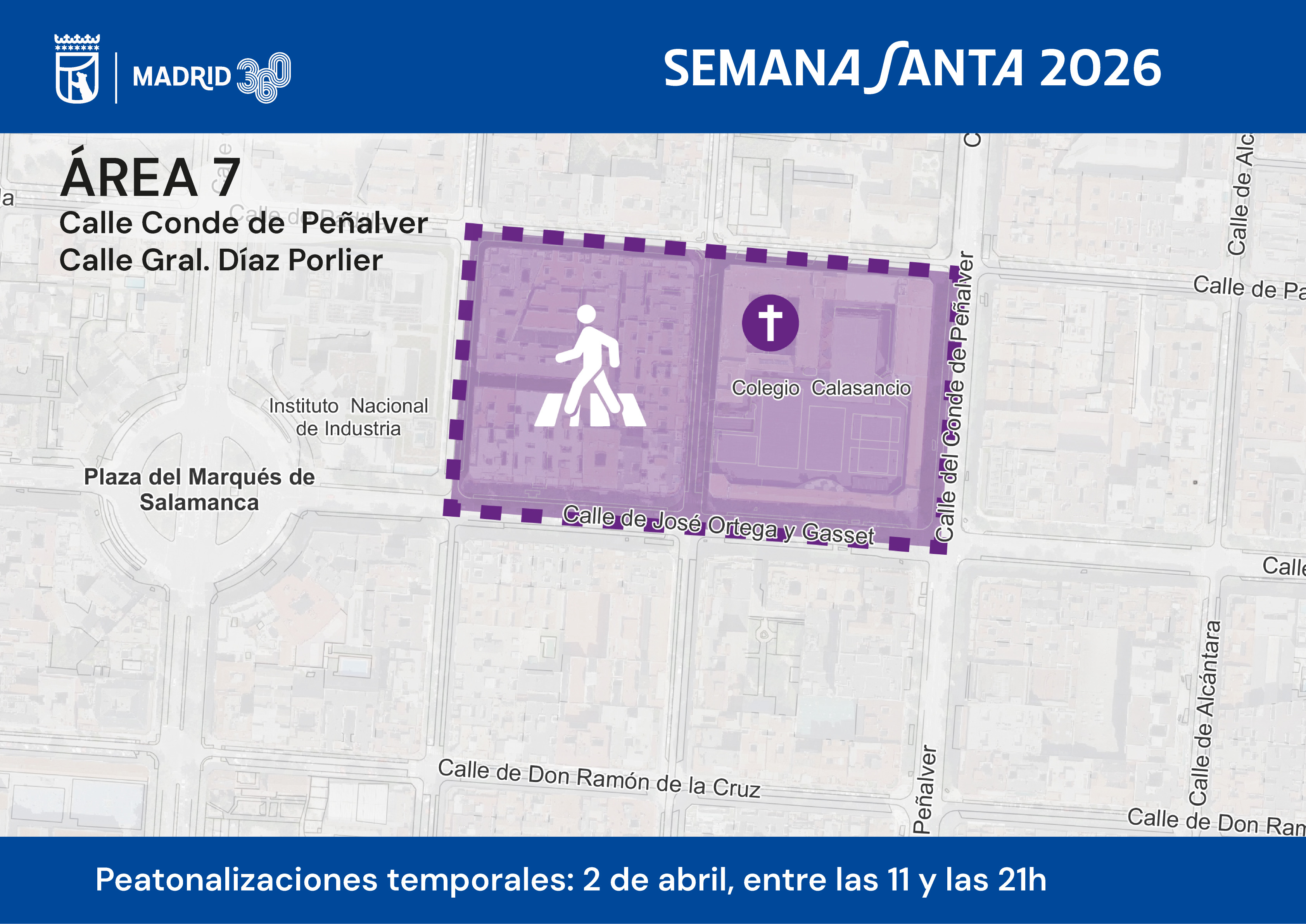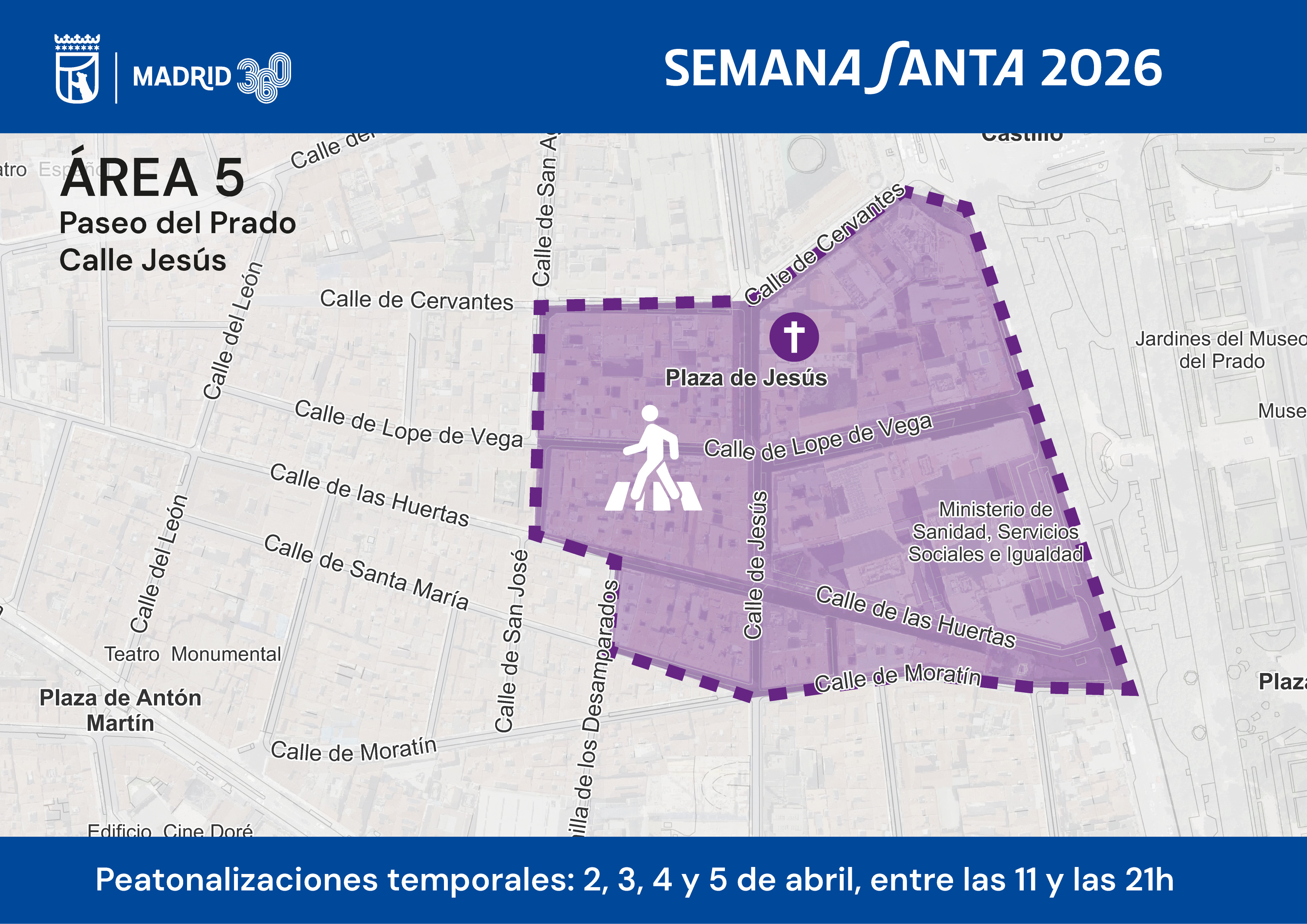 El Ayuntamiento de Madrid ha diseñado un dispositivo de peatonalización temporal en 75 calles para que madrileños y visitantes puedan disfrutar de las procesiones de la Semana Santa de la capital con todo su esplendor. Con el objetivo de garantizar la movilidad peatonal alrededor de las parroquias católicas más emblemáticas y concurridas de la ciudad en estas fechas, del próximo Jueves Santo, 2 de abril, al Domingo de Resurrección, día 5, el Consistorio habilitará siete áreas peatonales, seis de ellas en el distrito de Centro y una en el de Salamanca.