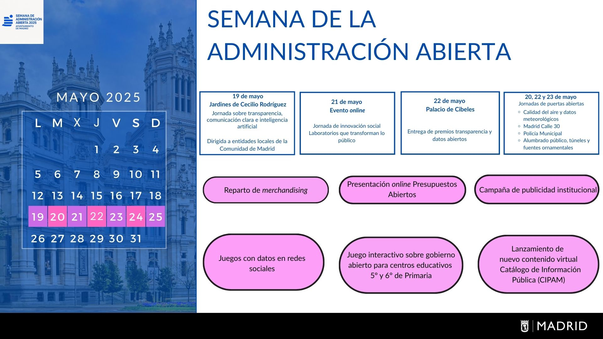 El Ayuntamiento de Madrid celebra, del 19 al 25 de mayo, la Semana de la Administración Abierta con diversas acciones para que los ciudadanos conozcan la información que tienen disponible en las webs municipales, cómo trabajan algunos centros administrativos que celebrarán jornadas de puertas abiertas o que adivinen, a través de diversos juegos con datos abiertos en redes sociales, curiosidades de la ciudad.
