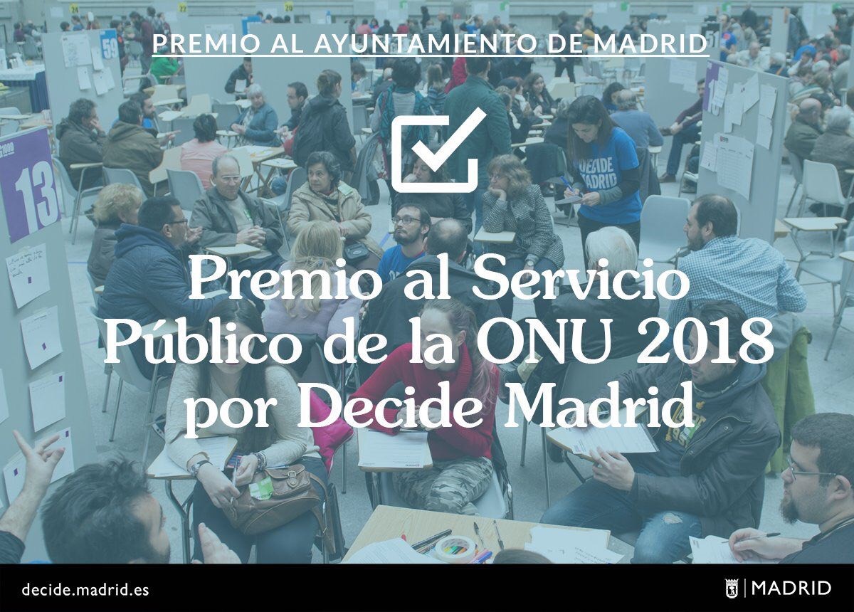 Decide Madrid, la plataforma de participación ciudadana del Ayuntamiento de Madrid, ha recibido un Premio de Servicio Público de la ONU en su edición 2018 por afrontar el reto de “establecer modelos de gobernanza más abiertos, transparentes, participativos e inclusivos”.