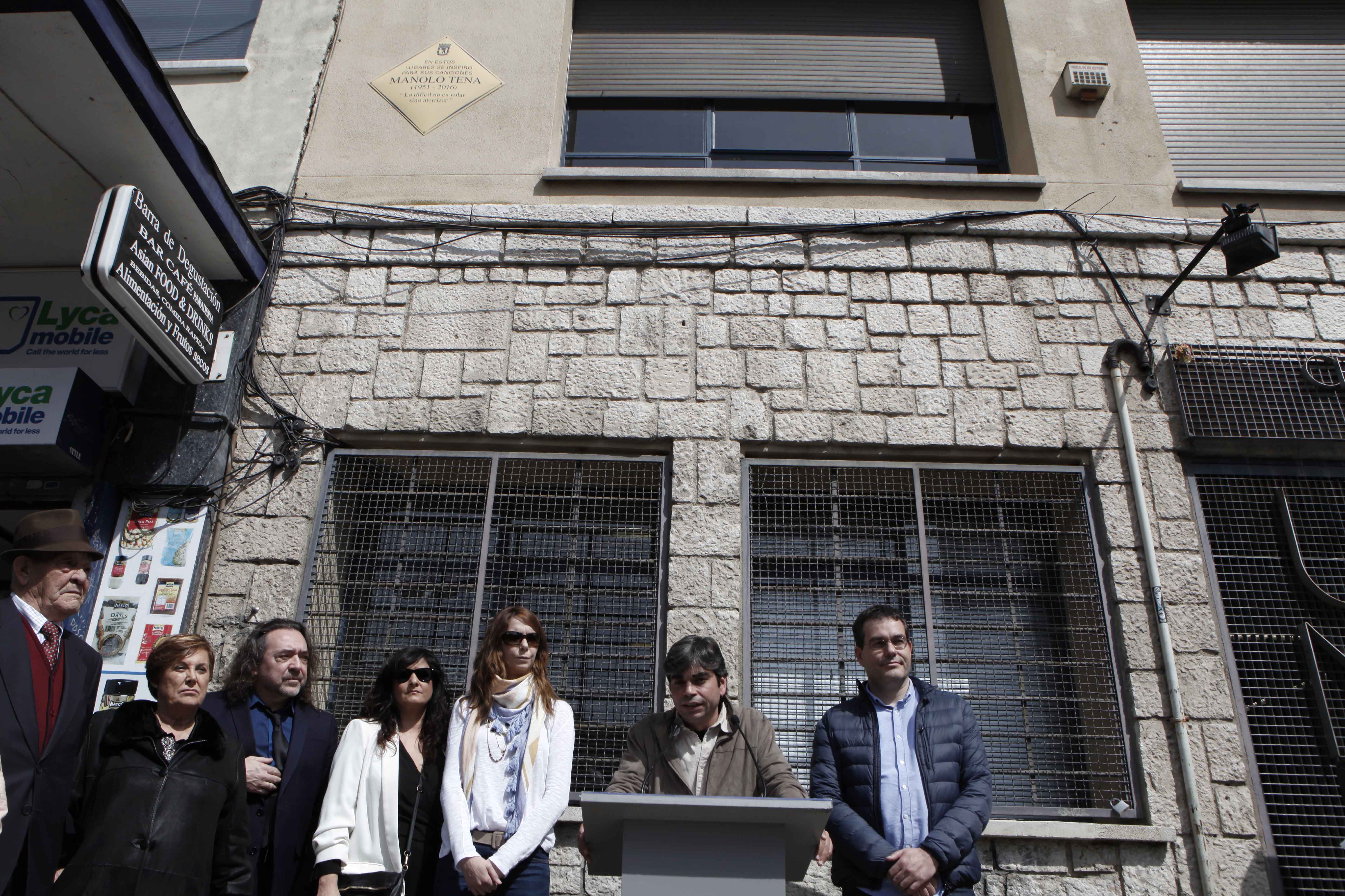 Al descubrimiento de la plaza, que ha tenido lugar hoy jueves, 30 de marzo, han asistido el concejal de Centro, Jorge García Castillo; Miguel y Borja Tena, hijos del músico, su viuda, Ana Valderas y la concejala María del Mar Espinar, del Grupo Municipal Socialista, promotor de esta iniciativa. García Castaño ha subrayado que “Manolo Tena es un referente de la cultura popular española y es un honor tener un recuerdo para él en Lavapies”.