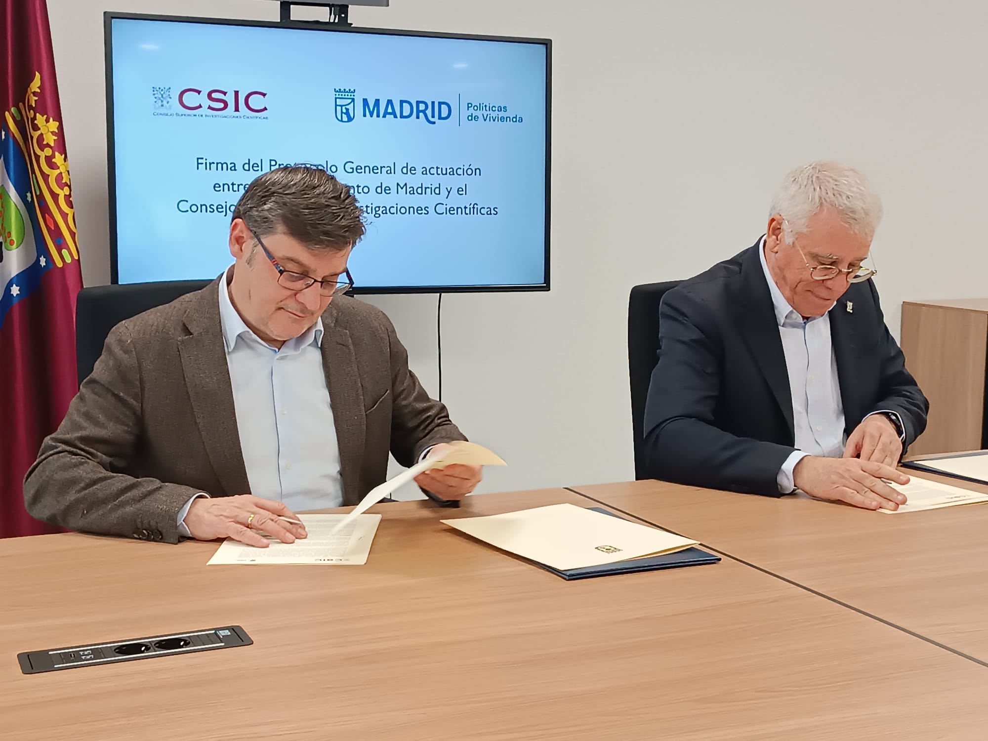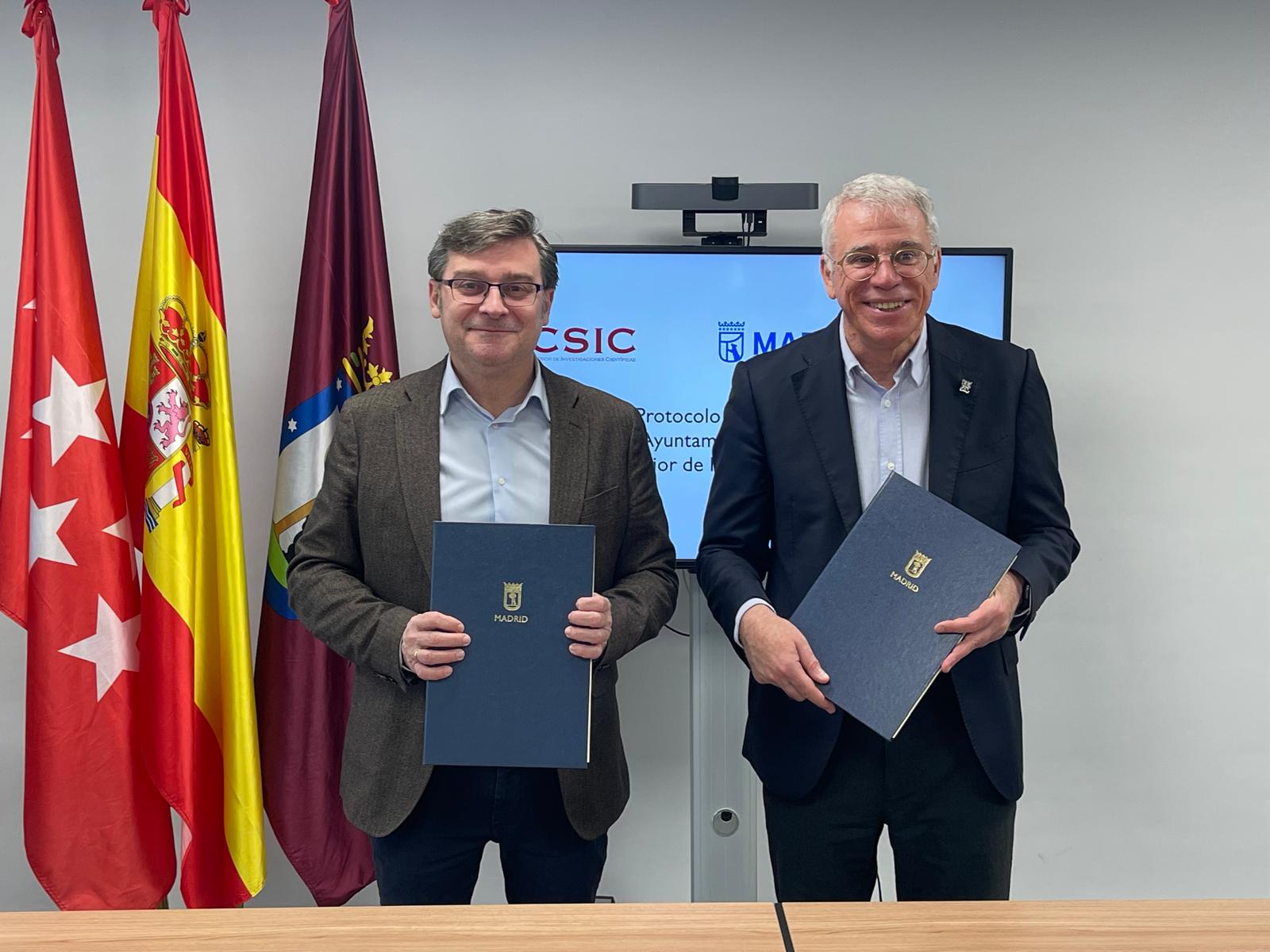 El delegado de Políticas de Vivienda y presidente de la Empresa Municipal de la Vivienda y Suelo de Madrid (EMVS Madrid), Álvaro González, ha firmado hoy un protocolo general de actuación con el Consejo Superior de Investigaciones Científicas (CSIC), representado por el vicepresidente de Organización y Relaciones Institucionales, Carlos Closa, para establecer un marco de colaboración en materia de investigación y divulgación vinculada a la regeneración urbana.
