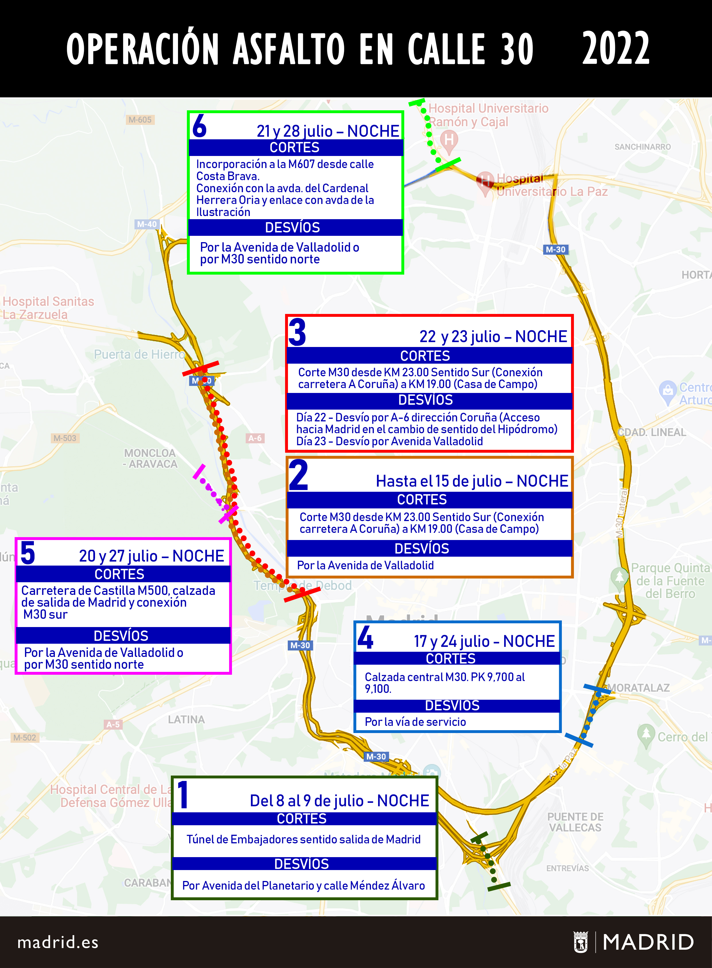 La actuación más significativa se realizará en la calzada exterior de la M-30, entre los puntos kilométricos 23 y 18, que se corresponde con el tramo que conecta la carretera de La Coruña y la Casa de Campo. Esta obra se acometerá en dos fases, la primera, que consiste en la retirada de la capa antigua mediante la técnica de fresado con nivelación, se desarrollará hasta el 15 de julio. La segunda fase, que incluye las labores de asfaltado, tendrá lugar entre el 22 y el 23 de julio.