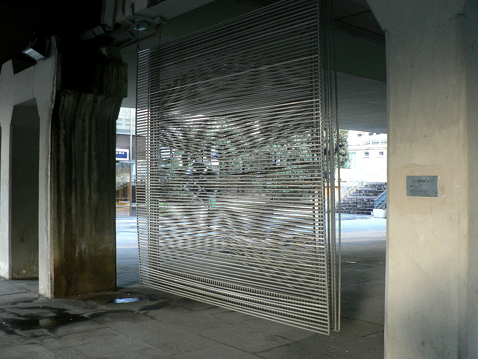 La escultura está formada por dos rejas suspendidas de unos cables que, con unos pasadores, cuelgan de argollas ancladas a la estructura del puente; así, la obra queda sometida al movimiento del viento, efecto buscado por el artista. Su estado de conservación es inadecuado y presenta patologías como oxidaciones provocadas por la humedad ambiental combinada con los elementos corrosivos de la contaminación, dilataciones del material como consecuencia de la oscilación térmica, deposiciones de aves, tubos flojos, desplazados o arrancados, bastidores alabeados, entre otras cuestiones. Asimismo, el movimiento natural de la obra, por estar suspendida y encontrarse a merced del viento, ha supuesto un desgaste de los anclajes.