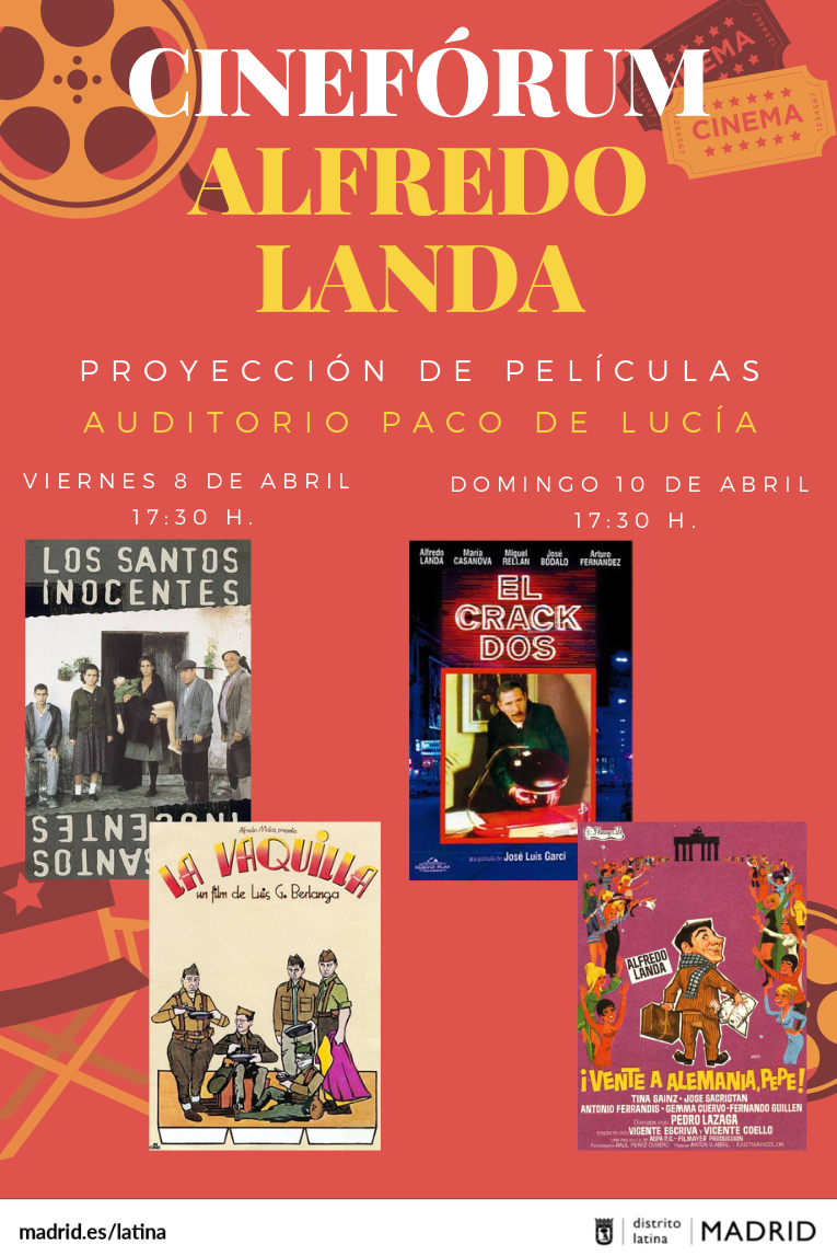 - La junta municipal ha organizado además el Cinefórum Alfredo Landa en el Auditorio Paco de Lucía, donde se proyectarán Los Santos Inocentes y La Vaquilla, el 8 de abril, y El Crack 2 y Vente a Alemania, Pepe, el 10 de abril, a las 17:30 h