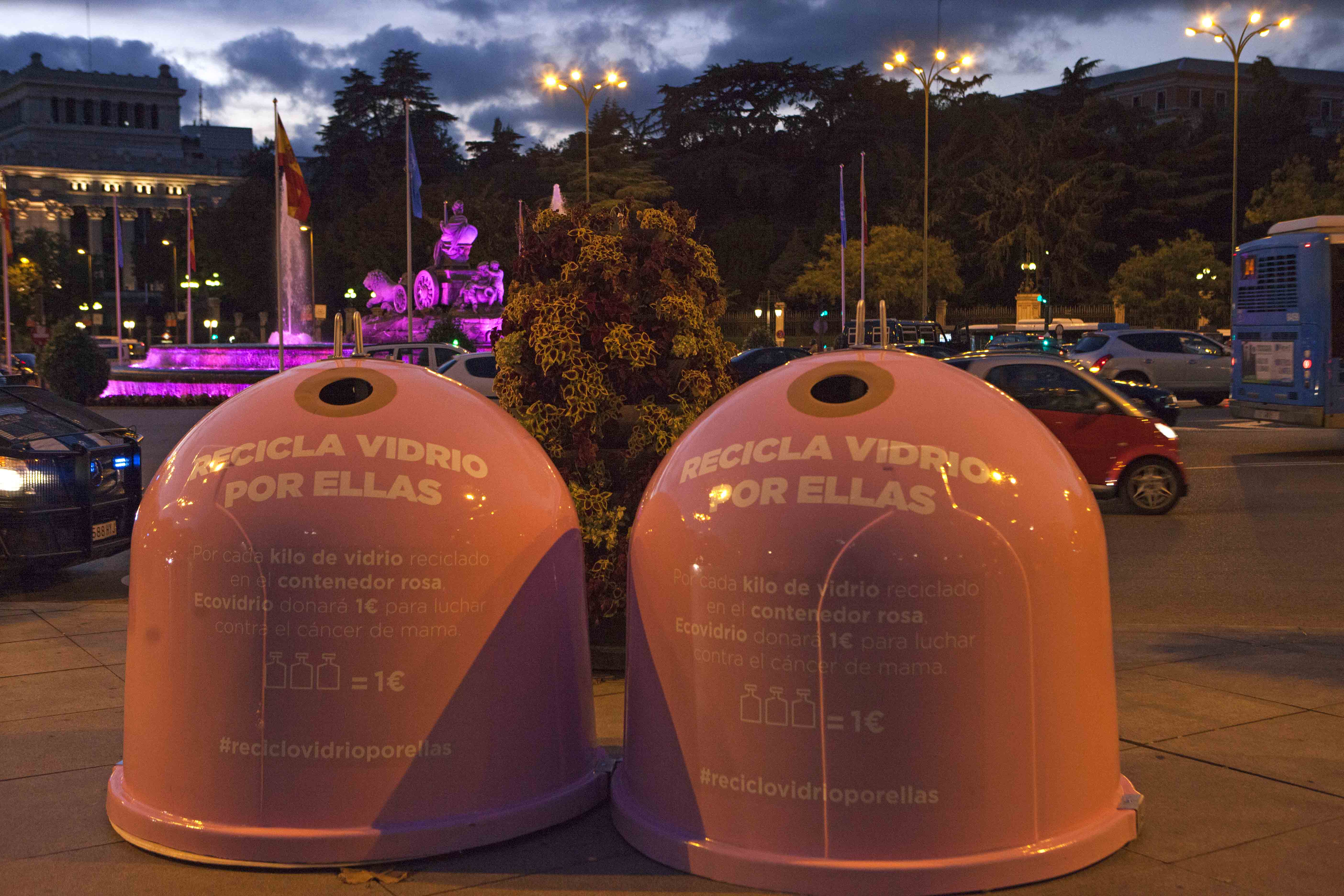 La fachada del Palacio de Cibeles, la fuente de la diosa Cibeles y los contenedores de reciclaje de vidrio situados de la plaza se han teñido de rosa para conmemorar el Día Mundial contra el Cáncer de Mama. La campaña de concienciación, acordada entre Ecovidrio y el Ayuntamiento, tendrá su broche musical el sábado 24 de octubre con un concierto en el Palacio de los Deportes.