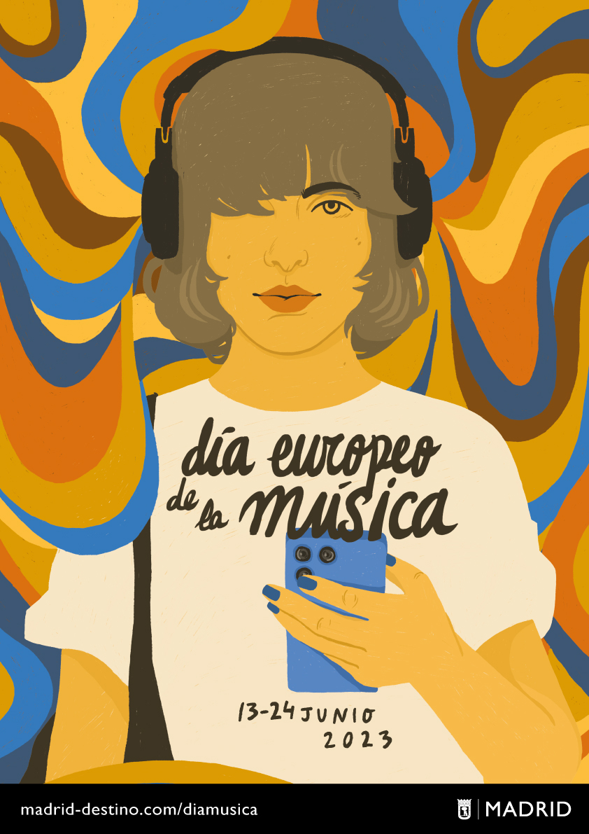 El cartel de la campaña del Ayuntamiento de Madrid diseñado por Ana Müshell muestra a una chica justo en el momento en que es envuelta por la amalgama de colores y ondulaciones porque está sonando su canción favorita. “La música nos envuelve, nos lleva a otras realidades. Es vibración y color, el movimiento de las emociones cuando suena una canción”, ha dicho su autora.
