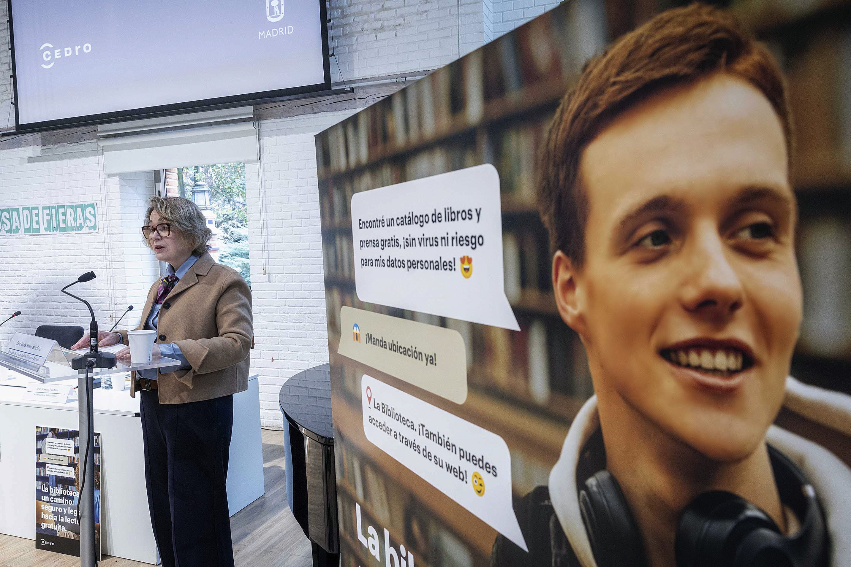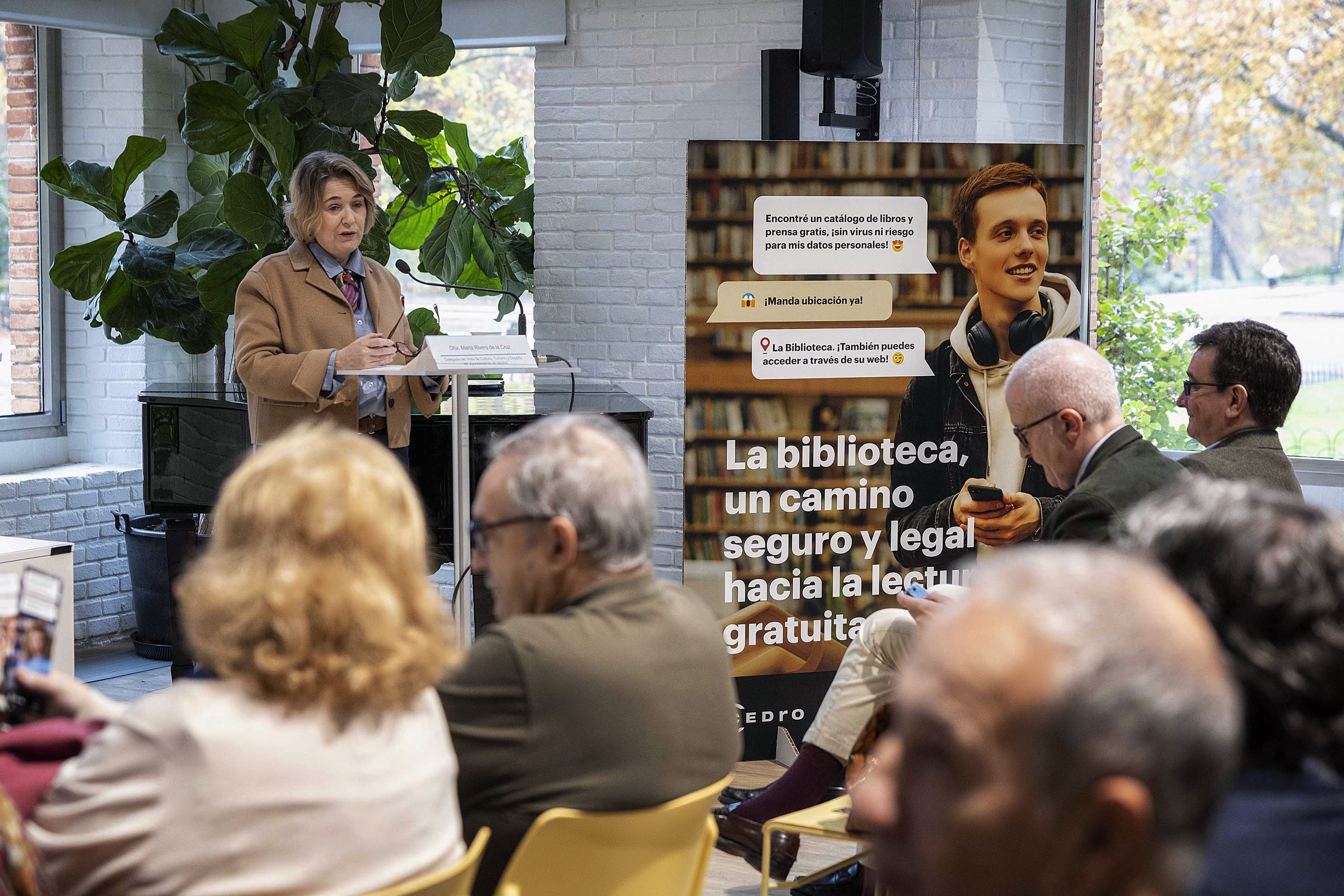 La delegada de Cultura, Turismo y Deporte, Marta Rivera de la Cruz, ha presentado esta mañana en la Biblioteca Pública Municipal Eugenio Trías. Casa de Fieras del Retiro la nueva campaña divulgativa que el Ayuntamiento de Madrid impulsa en colaboración con el Centro Español de Derechos Reprográficos (CEDRO) para concienciar sobre la importancia de acceder a contenidos editoriales de forma legal y segura. El acto ha contado, también, con la participación de la presidenta de CEDRO, Carme Riera; la escritora Soledad Puértolas y el editor Paulo Cosín.