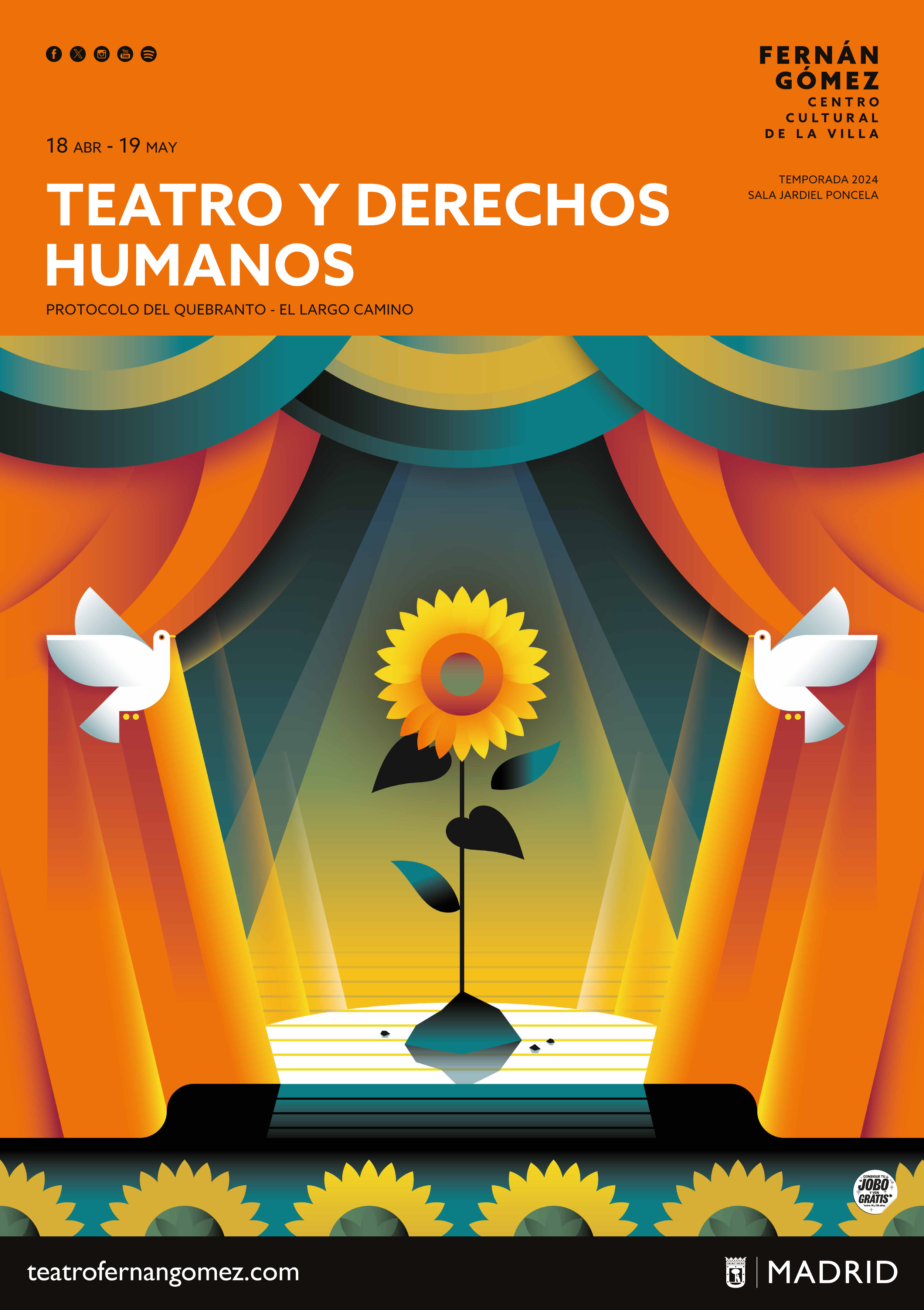 La Sala Jardiel Poncela del teatro Fernán Gómez. Centro Cultural de la Villa, espacio del Área de Cultura, Turismo y Deporte, acogerá la segunda edición del Ciclo de Teatro y Derechos Humanos, del 18 de abril al 19 de mayo, que en esta ocasión toma la actual situación de Ucrania como eje de la programación. Así se muestra en la imagen del cartel, obra de la ilustradora María Picassó, en el que, partiendo de los colores de la bandera ucraniana, ha querido lanzar un grito de esperanza y un deseo de paz y derechos humanos en mitad de la violencia.