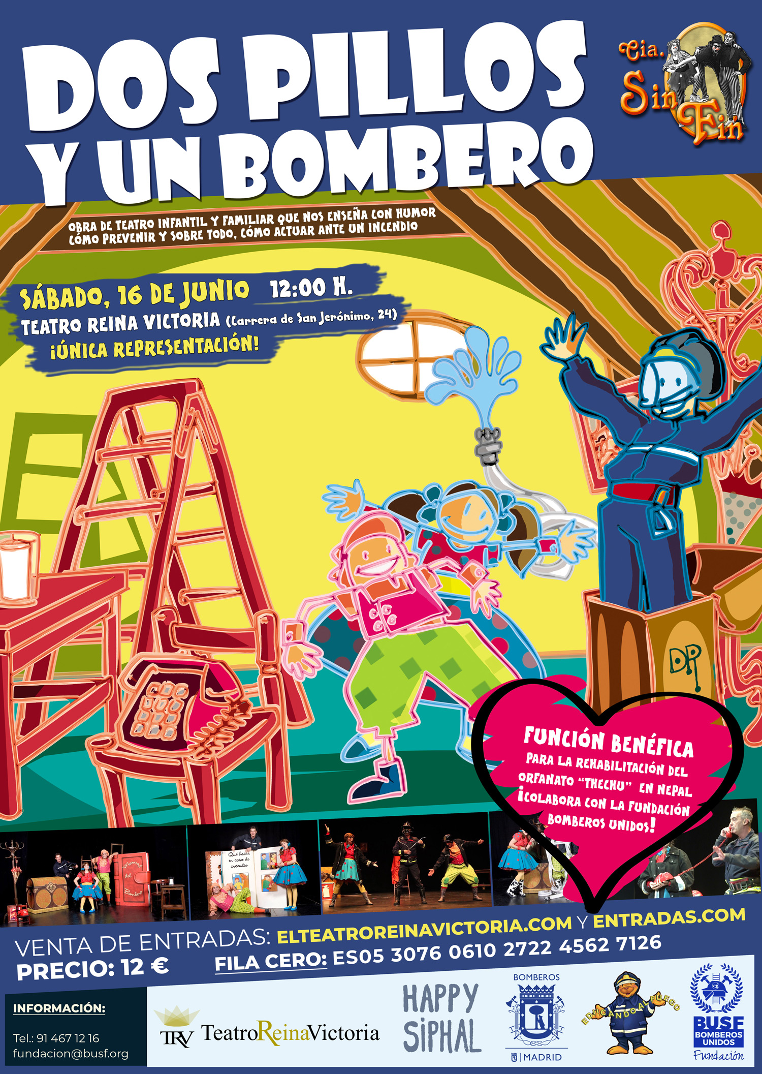 El Cuerpo de Bomberos del Ayuntamiento de Madrid y la Fundación Bomberos Unidos Sin Fronteras (BUSF) presentan el próximo sábado, 16 de junio, la obra “Dos pillos y un bombero”, una obra de teatro con fines solidarios que se representará en el Teatro Reina Victoria a las 12 horas. Todo el dinero recaudado con la venta de entradas, que tienen un coste de 12 euros, se destinará a la rehabilitación de un orfanato en la ciudad de Thechu, en Nepal, muy afectada por el terremoto que sufrió el país en 2015.