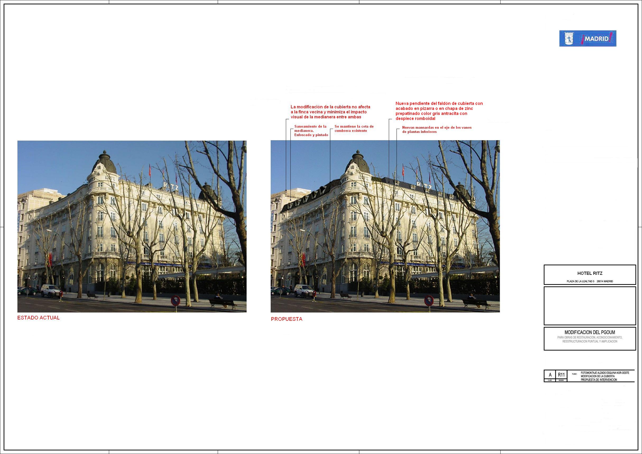 El Ritz, un edificio singular construido en 1908 con un diseño similar a los levantados por César Ritz en Londres y París, será renovado para adecuarse a las condiciones de un hotel de la máxima categoría. La Junta de Gobierno ha aprobado hoy de manera inicial una modificación del Plan General que permite acometer una cuidadosa intervención, poniendo el acento en la protección del inmueble. La reforma -proyectada por el estudio del prestigioso arquitecto Rafael de la Hoz- elimina los impactos negativos provocados por las instalaciones situadas en la cubierta, actualmente visibles desde la vía pública.