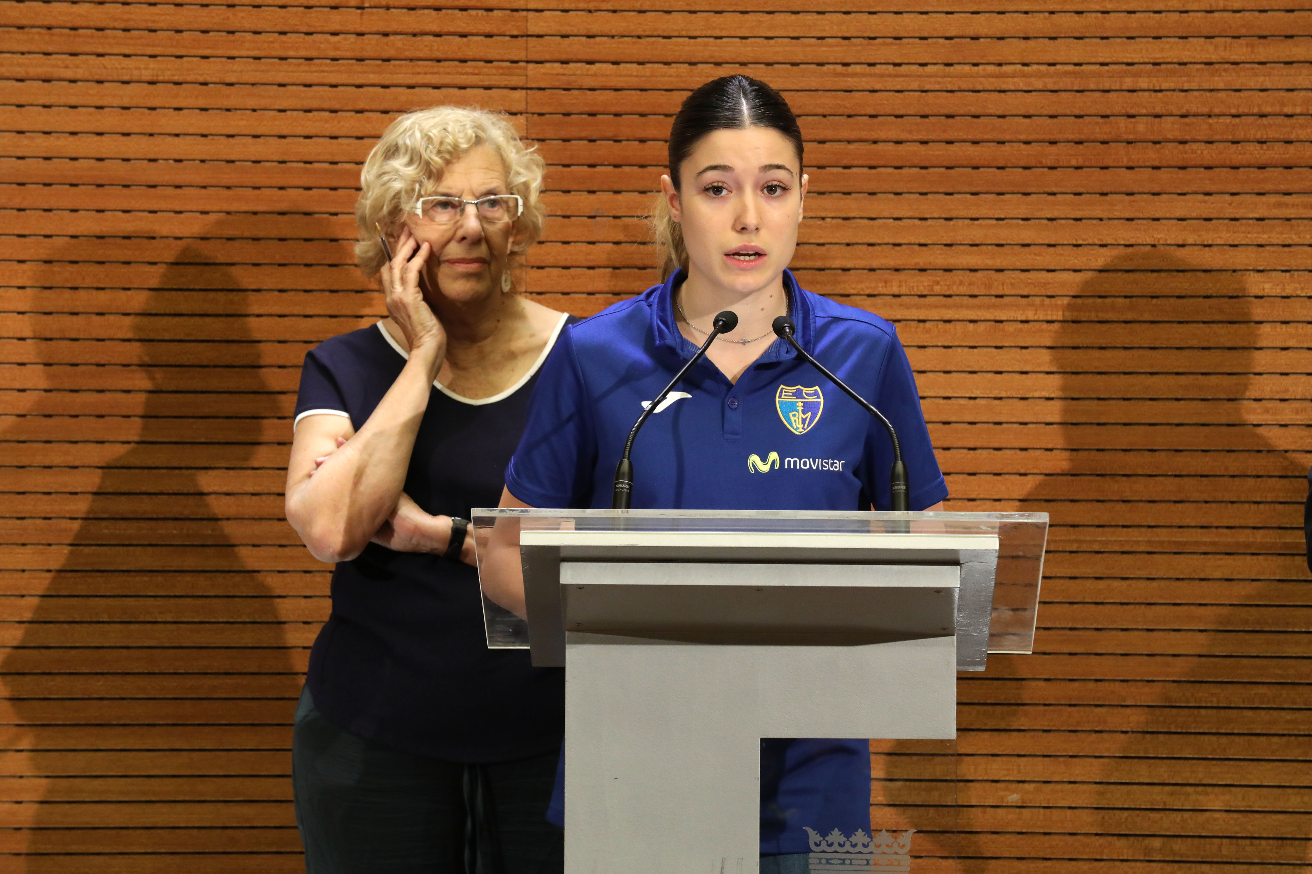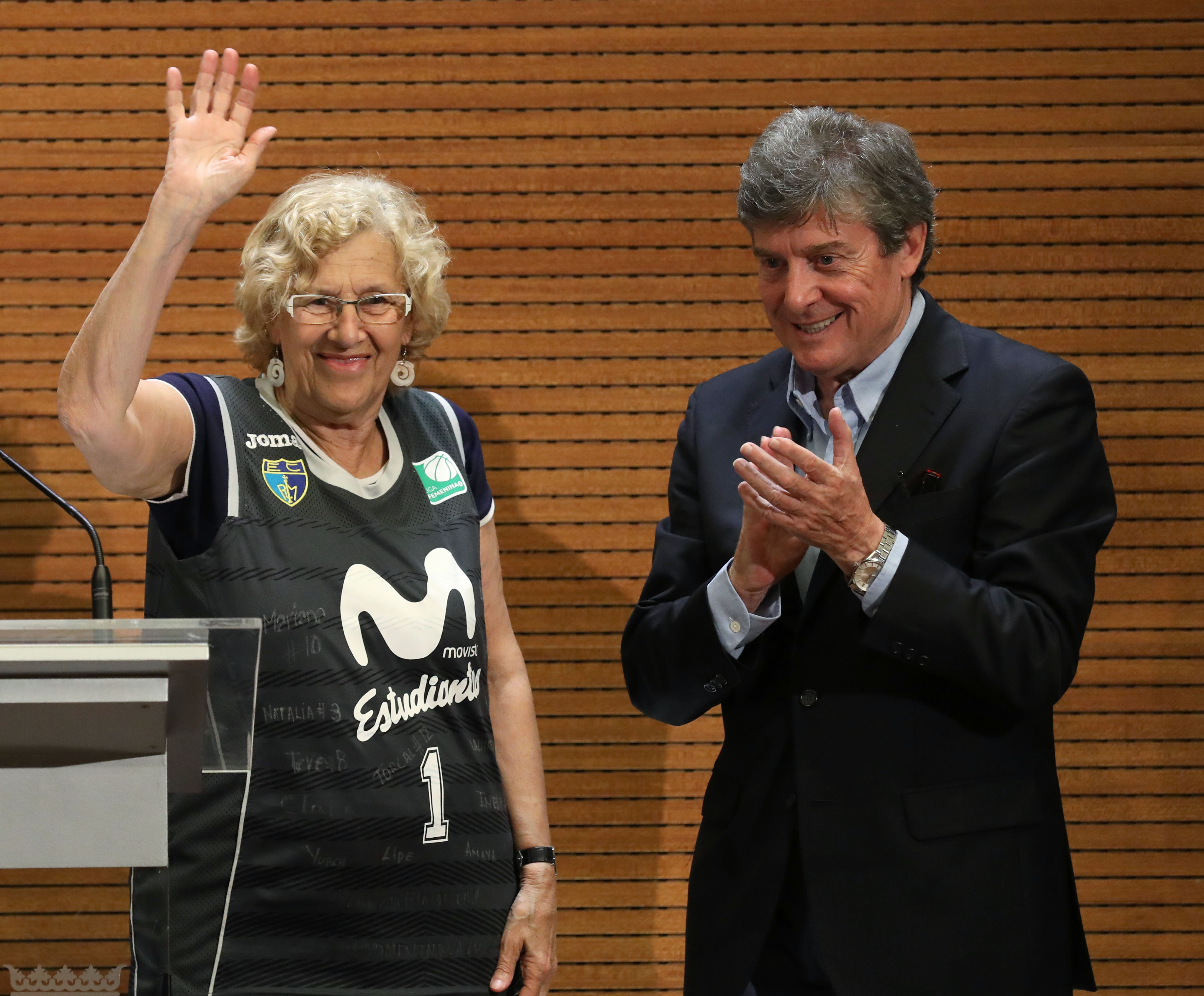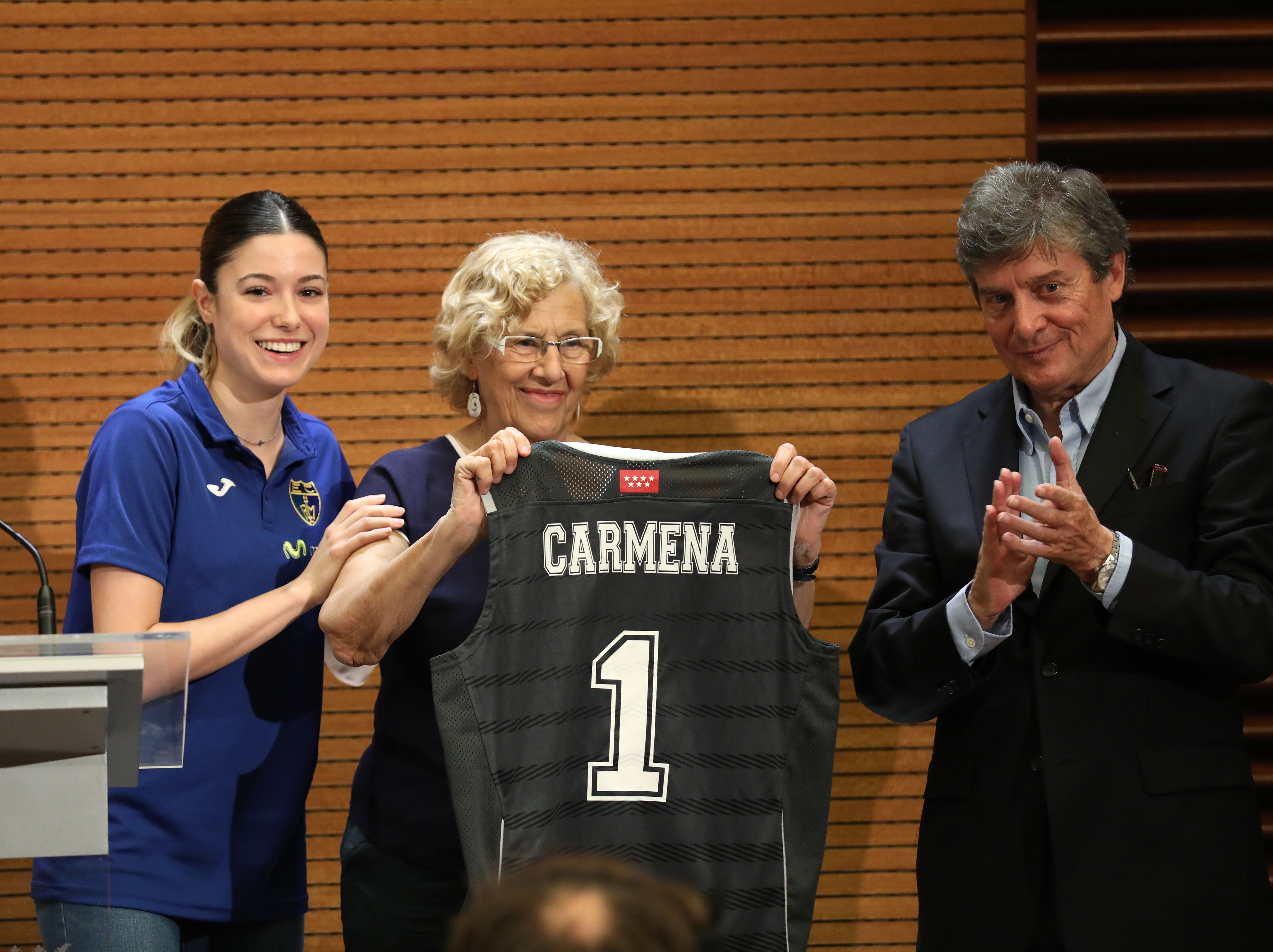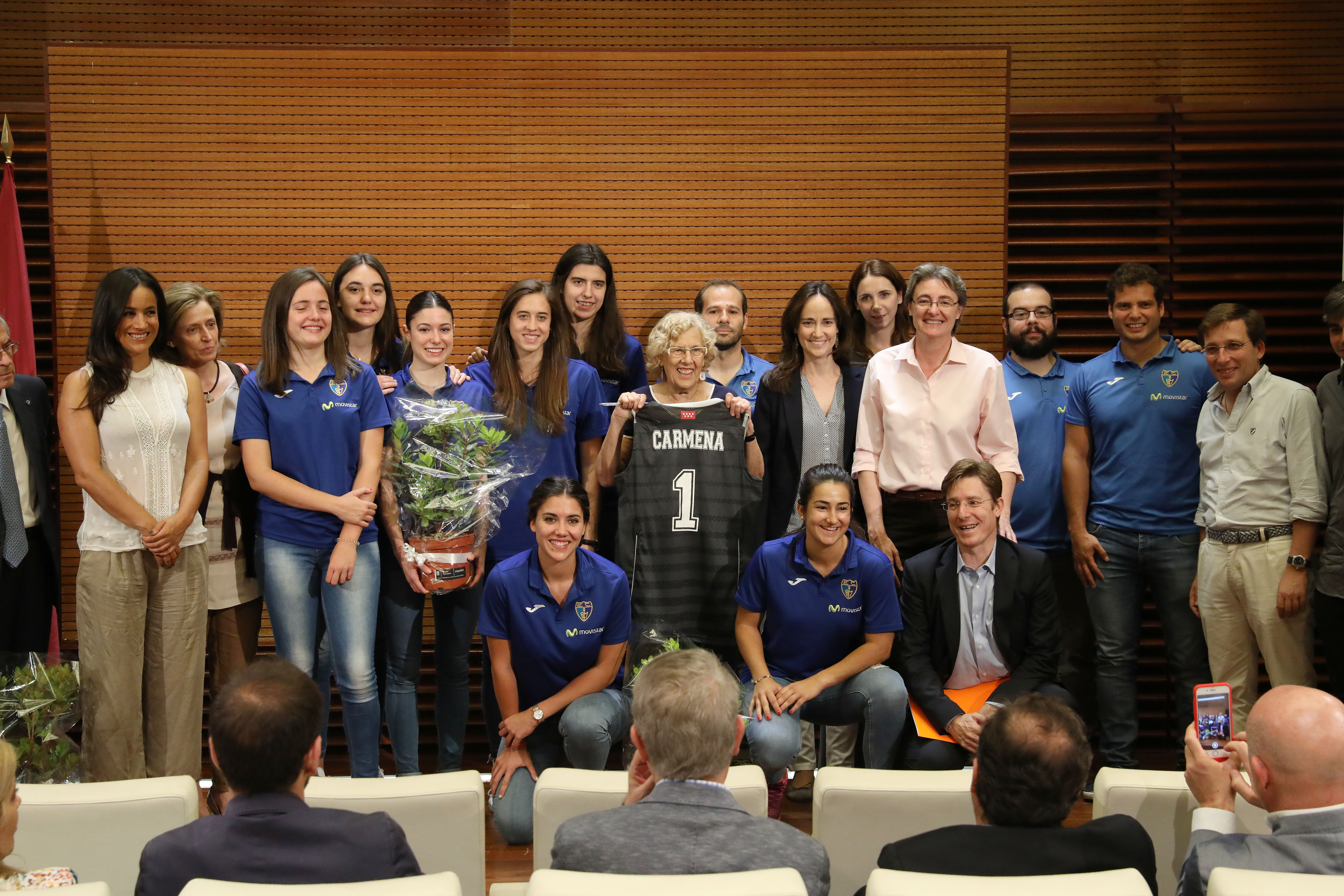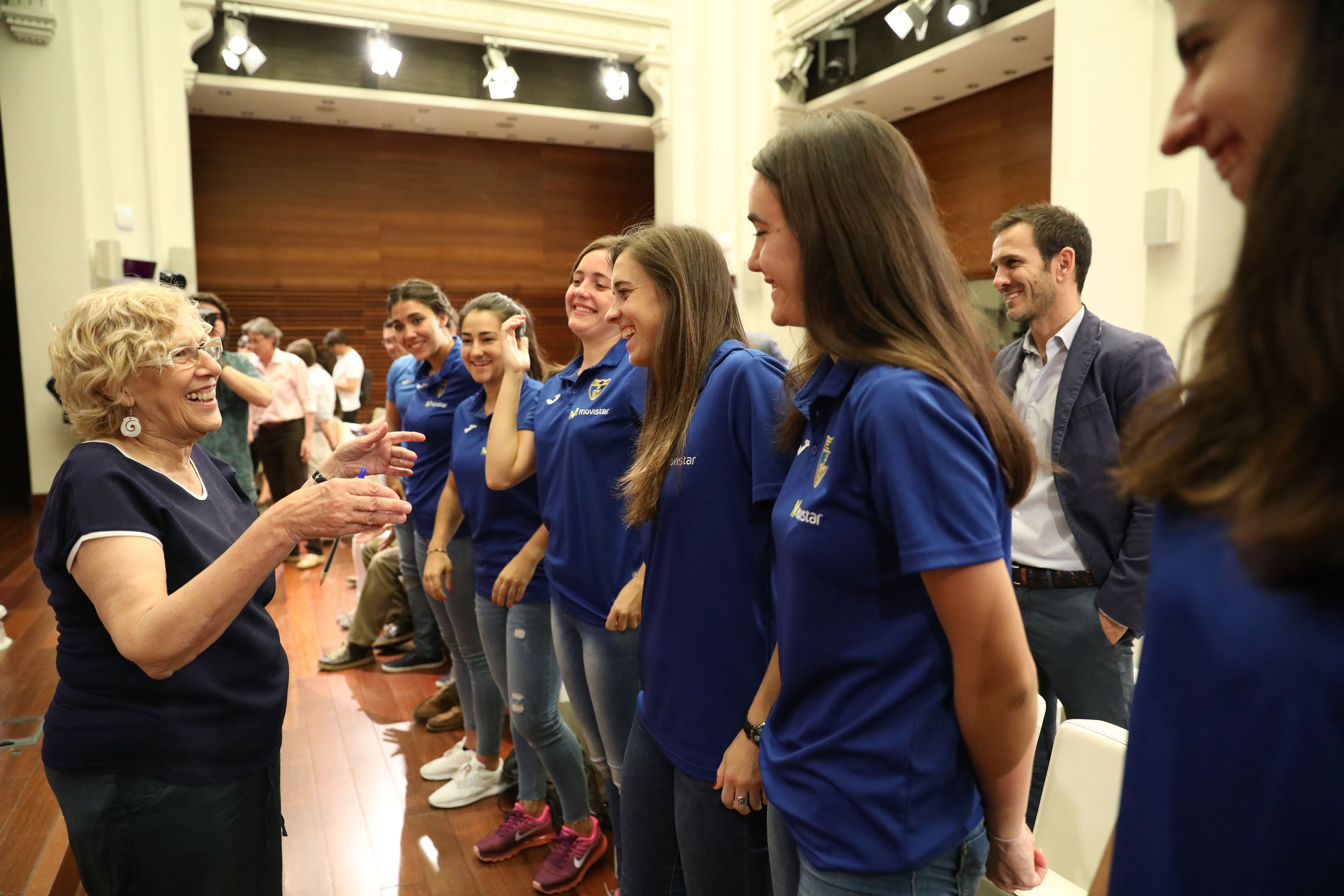 La alcaldesa de Madrid, Manuela Carmena, ha recibido hoy, viernes 2 de junio, a las jugadoras del Club Movistar Estudiantes de Baloncesto Femenino, acompañadas por los presidentes del club y del equipo, Fernando Galindo y Miguel Ángel Bufalá, respectivamente, para celebrar juntos el ascenso, después de siete años, a la Liga Femenina 1. Junto a la alcaldesa han estado los portavoces del PP y Ciudadanos, José Luis Martínez Almeida y Begoña Villacís, respectivamente, y Mar Espinar, en representación del grupo socialista. La alcaldesa, tras felicitar a las conocidas como Women in black, les ha obsequiado con un madroño. En nombre de las jugadoras ha intervenido Rocío Torcal quien, a su vez, le ha regalado a Manuela Carmena una camiseta del club personalizada.