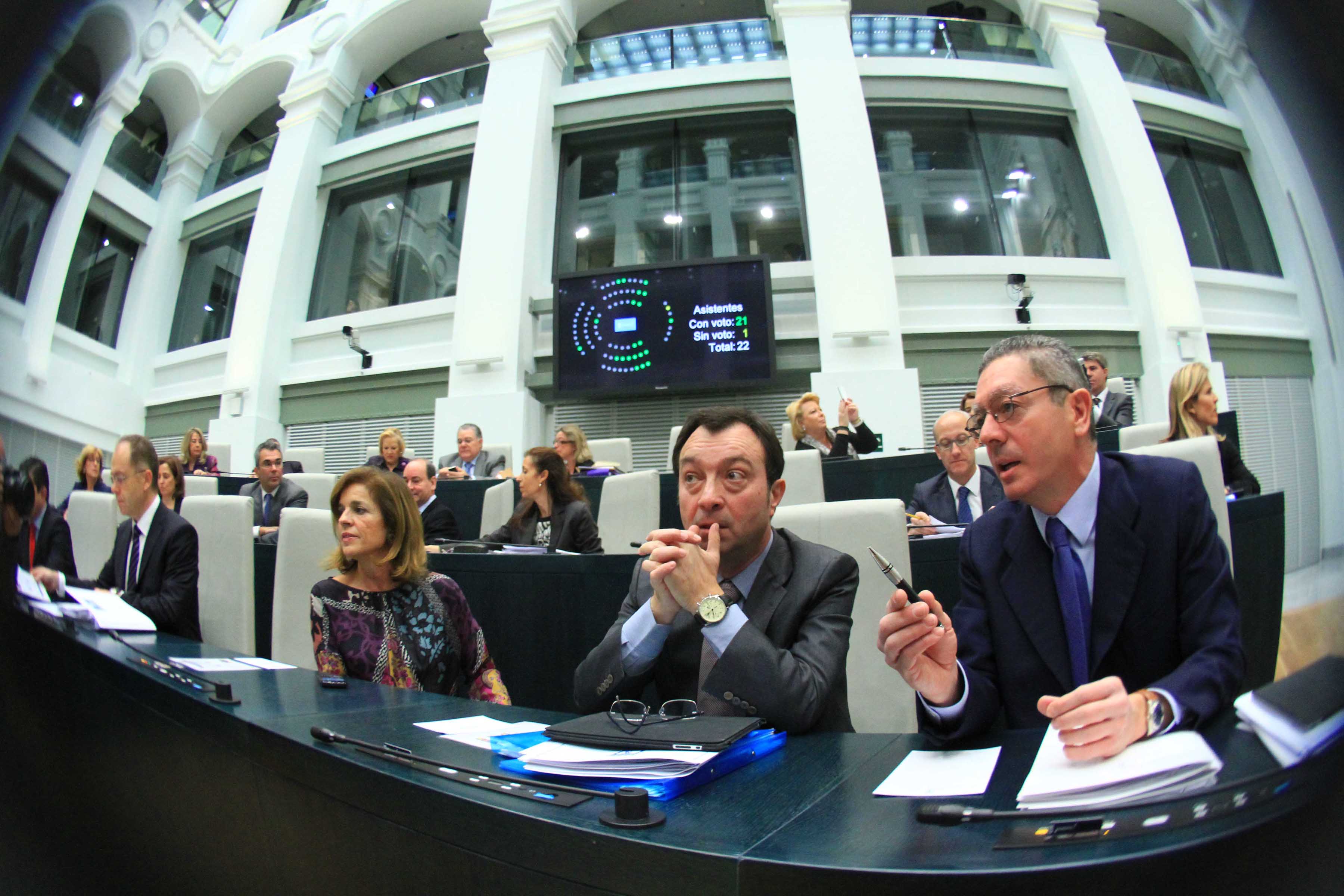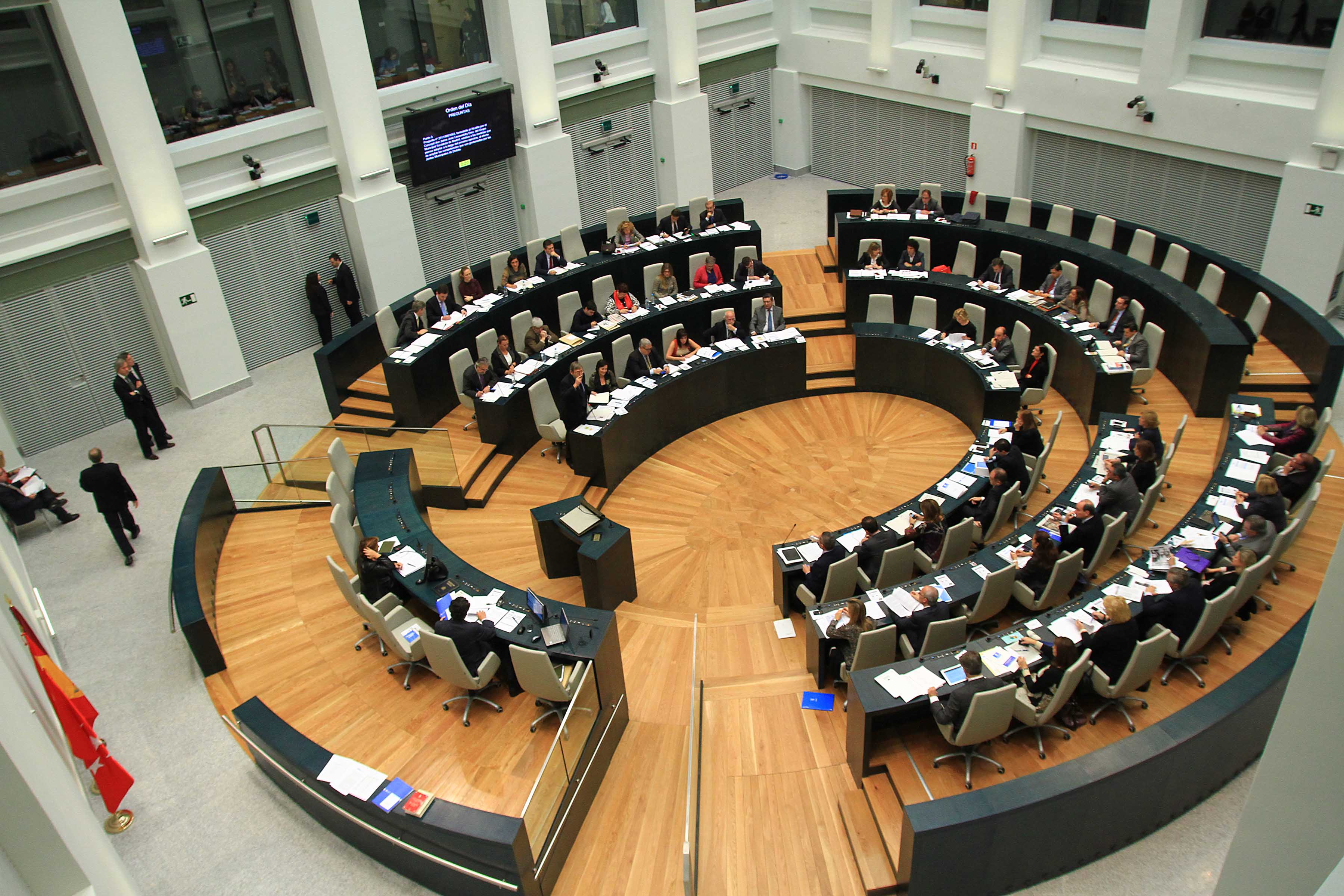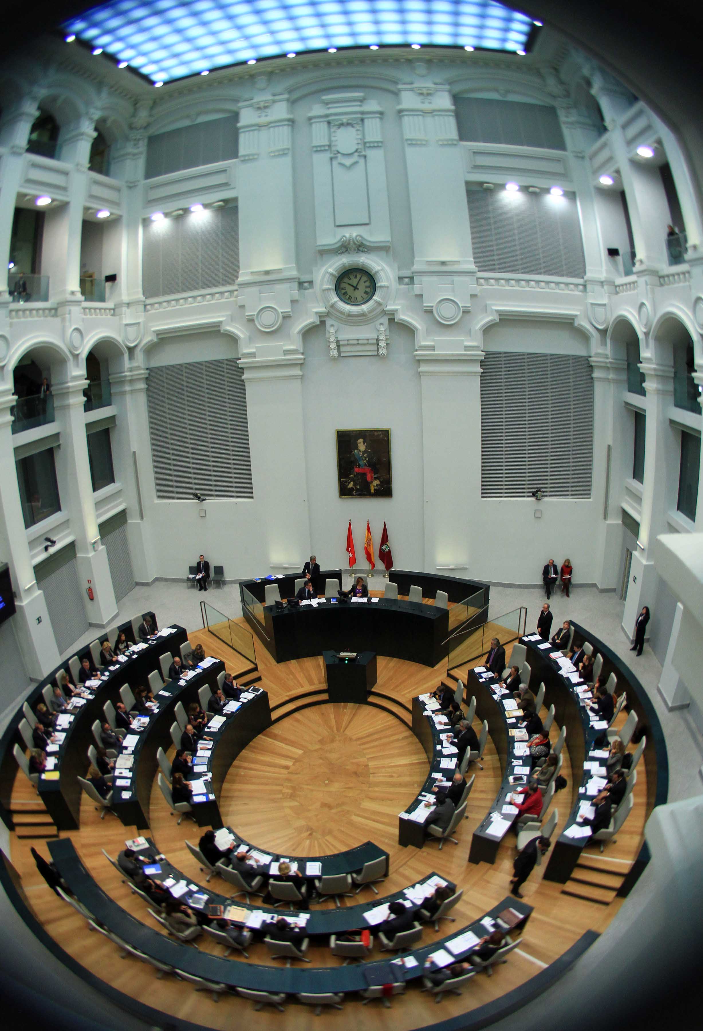 Hoy se ha celebrado el primer Pleno Municipal en el Palacio de Cibeles. El nuevo Salón de Plenos, que fue visitado ayer por S.M. el Rey, ha abierto sus puertas para acoger al Gobierno municipal y a los concejales de los cuatro grupos municipales: PP, PSOE, IU y UPyD. El Salón está construido al mismo nivel que el patio-pasaje de Montalbán y su accesibilidad es idéntica a la del patio central, proyectado en su día por Antonio Palacios. El nuevo espacio, distribuido en varias alturas y que carece de barreras arquitectónicas, consta de 69 escaños escalonados y una mesa presidencial para 7 miembros. Cuenta además con 12 cabinas para prensa escrita, 10 para emisoras de radio y 4 para traducción simultánea. A esto hay que añadir 81 asientos para el público y una sala de trabajo para 23 periodistas. Todas las estancias aledañas al Salón disponen de circuitos cerrados de tv que permiten seguir los acontecimientos de las sesiones./