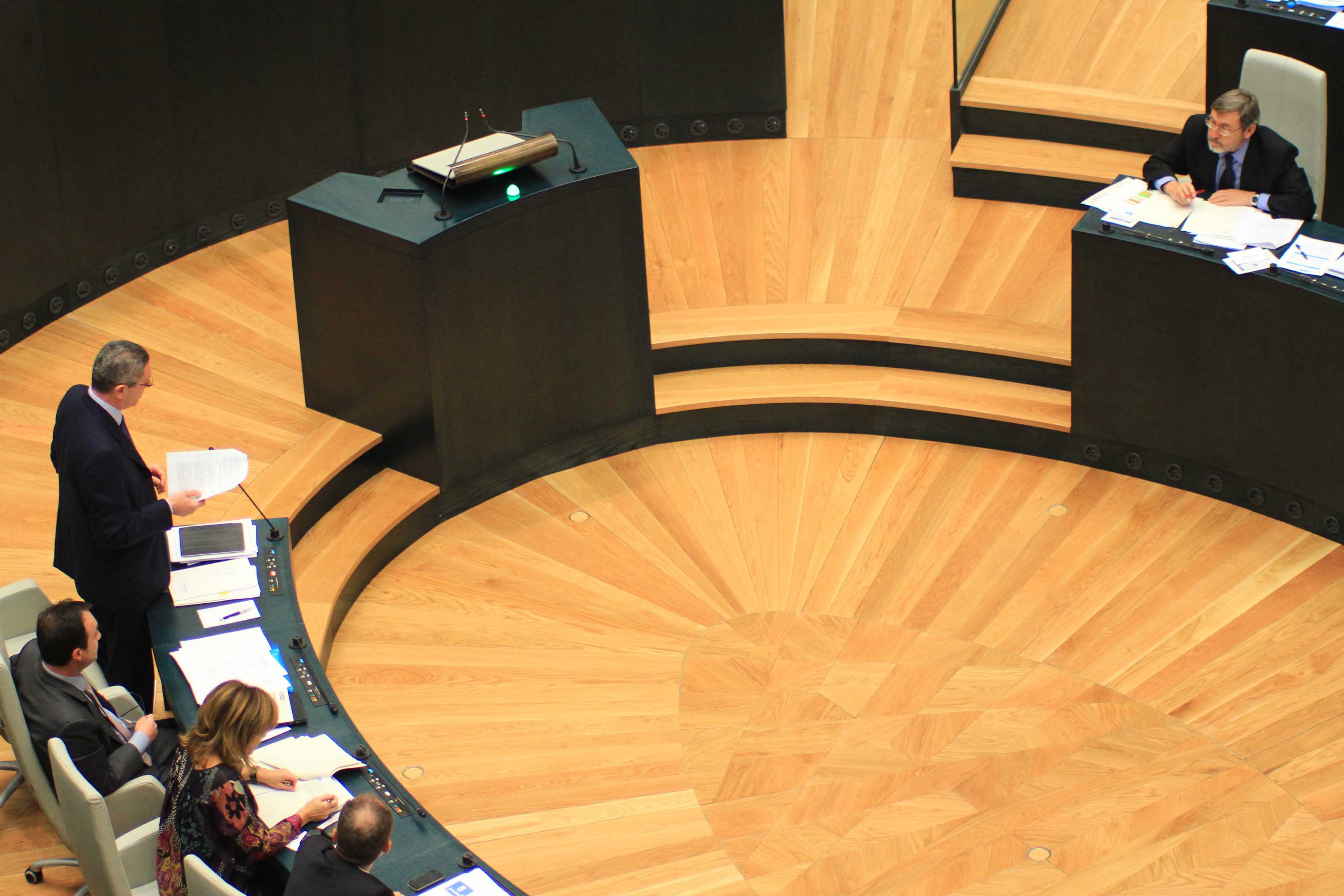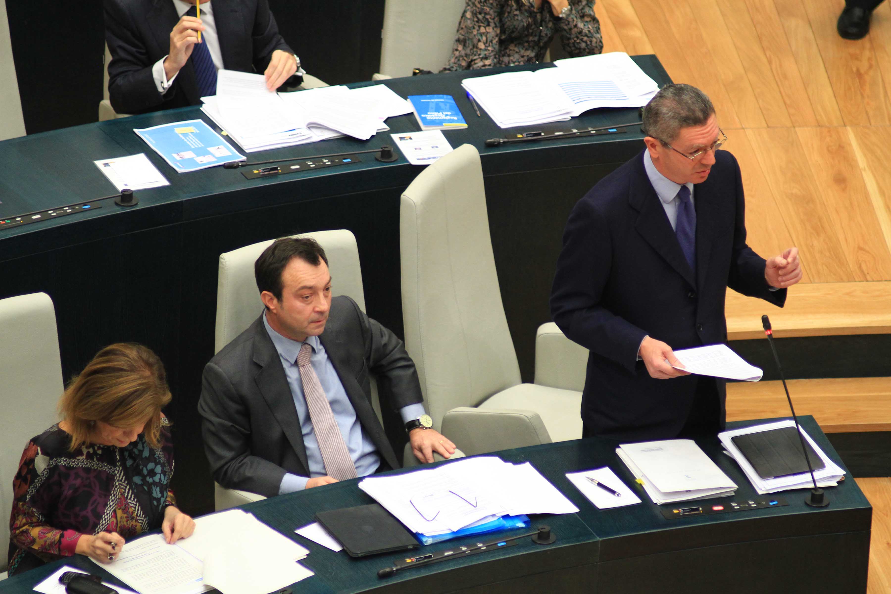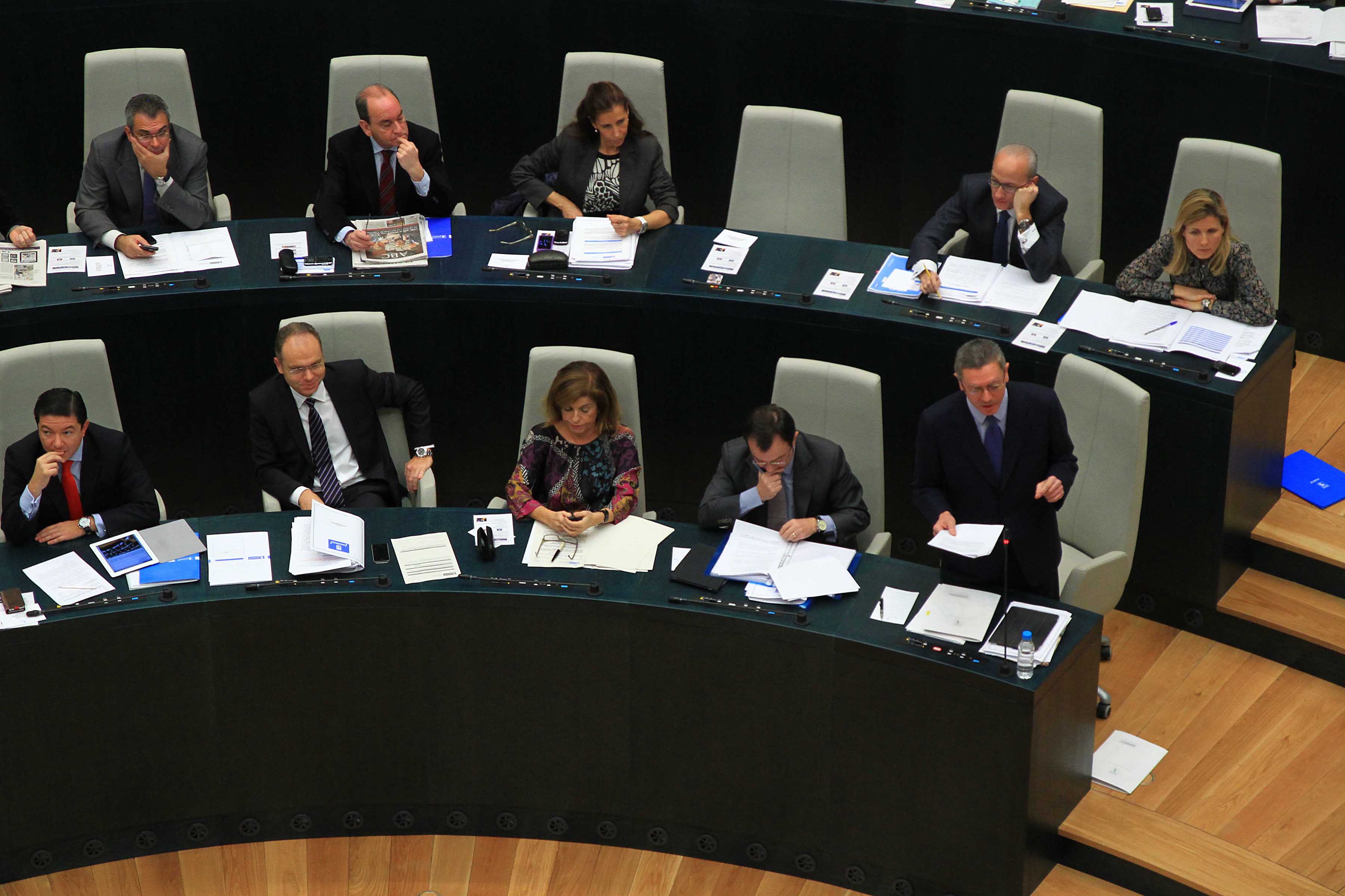 Hoy se ha celebrado el primer Pleno Municipal en el Palacio de Cibeles. El nuevo Salón de Plenos, que fue visitado ayer por S.M. el Rey, ha abierto sus puertas para acoger al Gobierno municipal y a los concejales de los cuatro grupos municipales: PP, PSOE, IU y UPyD. El Salón está construido al mismo nivel que el patio-pasaje de Montalbán y su accesibilidad es idéntica a la del patio central, proyectado en su día por Antonio Palacios. El nuevo espacio, distribuido en varias alturas y que carece de barreras arquitectónicas, consta de 69 escaños escalonados y una mesa presidencial para 7 miembros. Cuenta además con 12 cabinas para prensa escrita, 10 para emisoras de radio y 4 para traducción simultánea. A esto hay que añadir 81 asientos para el público y una sala de trabajo para 23 periodistas. Todas las estancias aledañas al Salón disponen de circuitos cerrados de tv que permiten seguir los acontecimientos de las sesiones./