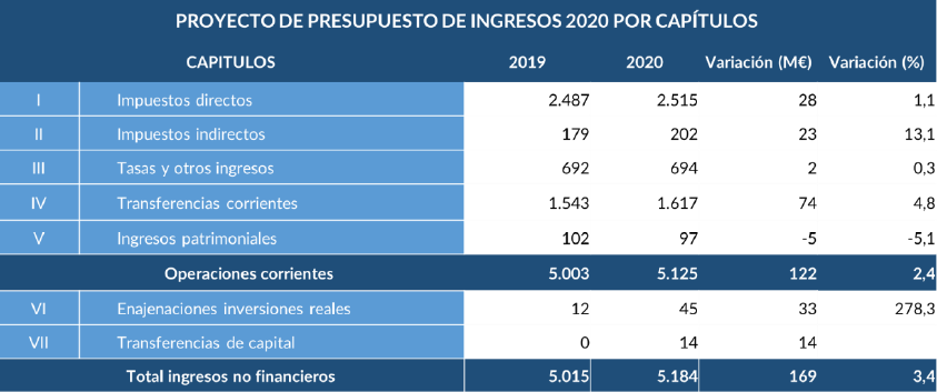 La previsión de ingresos asciende a 5.184 millones, o lo que es lo mismo 169 millones más que para el presupuesto de 2019 (+3,4 %). El incremento se fundamenta sobre todo en el aumento en un 4,8 % de las transferencias corrientes (74 millones más), un 13,1 % de la participación en los impuestos indirectos (23 millones de euros más) y del 1,1 % de los directos (28 millones más).