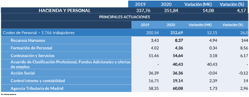 El presupuesto para el Área de Hacienda y Personal asciende a 351,71 millones y contiene la aportación de 60 millones al Organismo autónomo de la Agencia Tributaria de Madrid. Este Área de Gobierno es el encargado de realizar la planificación eficaz de la política presupuestaria y los recursos públicos del Ayuntamiento de Madrid.