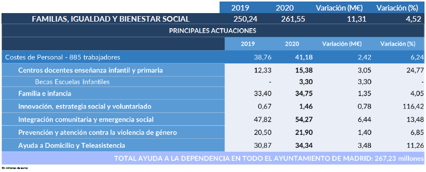 El presupuesto del Área de Gobierno de Familias, Igualdad y Bienestar Social para el ejercicio de 2020 es de 261,55 millones, lo que supone un crecimiento del 4,52 %, lo que permitirá potenciar los niveles de prestación y cobertura de los servicios sociales y, en definitiva, prestar unos servicios públicos de calidad, accesibles para toda la ciudadanía y avanzar hacia una sociedad más justa y equitativa.