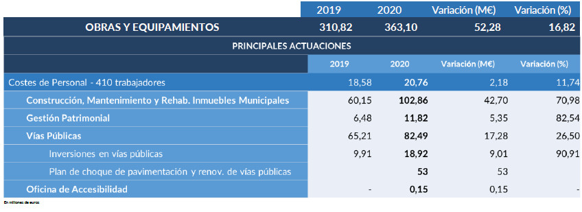 El presupuesto del Área de Gobierno de Obras y Equipamientos para el ejercicio 2020 asciende a 363,1 millones de euros, lo que supone un incremento de más de 52 millones respecto a 2019, es decir, un aumento del 16,82 %.