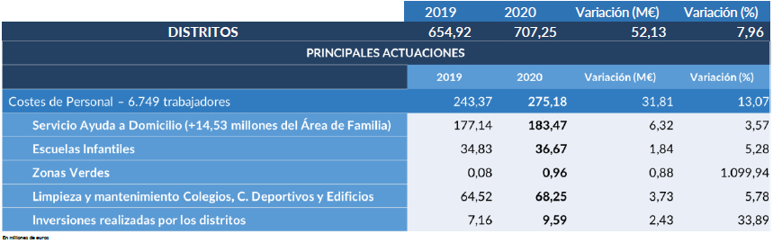 Además, se produce un fuerte incremento en las actuaciones en zonas verdes, que crece diez veces, en lo que constituye una apuesta por la regeneración urbana para mejorar la calidad de vida de los distintos distritos. En este sentido, la dotación de las inversiones de los distritos, el refuerzo de la limpieza y el mantenimiento de sus infraestructuras, entre las que se encuentran colegios o centros deportivos, se incrementa un 5,78 % hasta superar los 68 millones de euros. Destaca el aumento en la dotación de escuelas infantiles, que crece un 5,28 % hasta alcanzar los 36,67 millones.