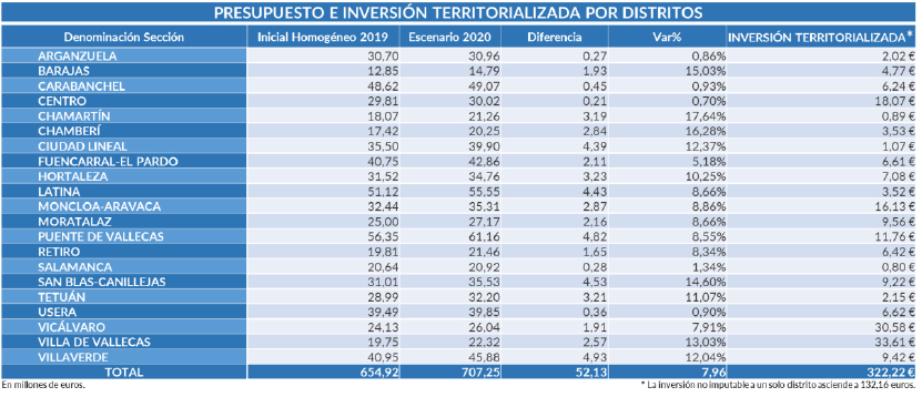 En cuanto a las inversiones territorializadas por distritos, destacan por su importe aquellas que se van a llevar a cabo en el distrito Villa de Vallecas (33,61 millones), Vicálvaro (30,58 millones), Centro (18,07 millones), Moncloa-Aravaca (16,13 millones) y Puente de Vallecas (11,76 millones).