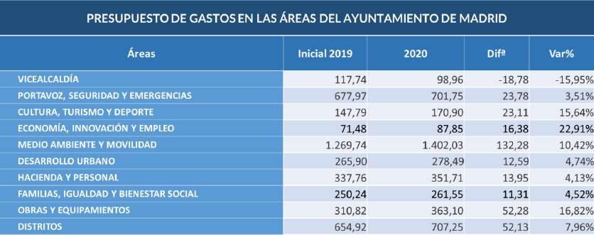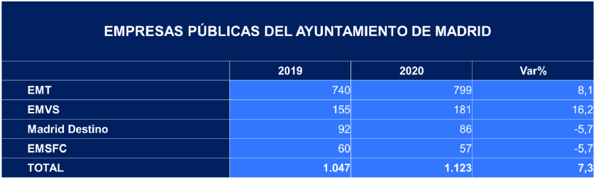 El presupuesto total de las empresas públicas municipales para 2020 asciende a 1.122,9 millones de euros, lo que supone un incremento de 76,17 millones respecto a 2019. La empresa con un mayor peso en este agregado es la EMT, que con un presupuesto de 799 millones, recibe un 71 % del total. La EMVS tiene un presupuesto de 180,6 millones, Madrid Destino de 86,32 y la EMSFCM de 56,57.