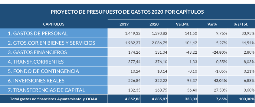 El Presupuesto de gastos aumenta un 7,6 % con respecto al Presupuesto inicial de 2019, hasta alcanzar los 4.686 millones de euros. El principal incremento cuantitativo se produce en el capítulo 1, motivado por el aumento salarial previsto y sobre todo por los compromisos adquiridos en materia de personal en los primeros meses del año. También destaca la reducción de casi el 25 % de los gastos financieros hasta los 131,04 millones.