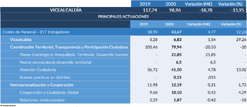 El presupuesto total del Área Delegada de Coordinación Territorial, Transparencia y Participación Ciudadana desciende a 98,96 millones, un -15,95 % respecto a 2019.