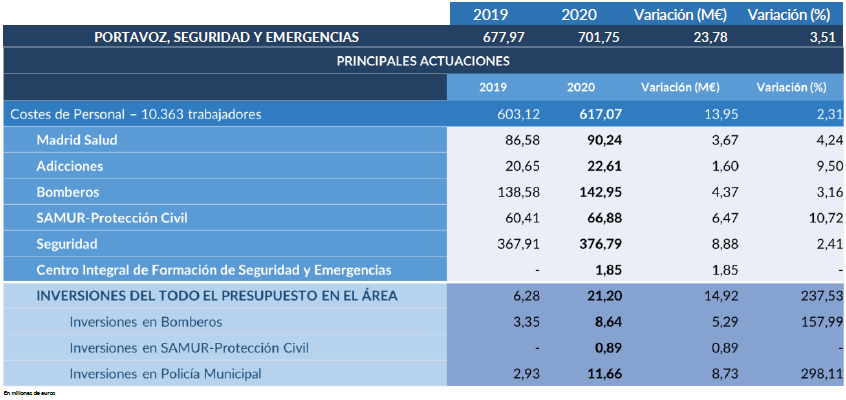 El presupuesto del Área de Portavoz, Seguridad y Emergencias registra un incremento del 3,5 % y asciende a 701.748.320 euros. Las inversiones para dotar a Policía Municipal, Bomberos y SAMUR-Protección Civil de los mejores medios posibles y unas instalaciones adecuadas aumentan un 237 %. Además, destacan los 617,07 millones destinados a retribuciones de los 10.363 trabajadores (bomberos, policías, personal sanitario…), que representan el 88 % del presupuesto del Área.