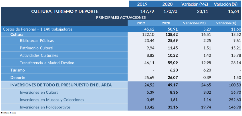 El presupuesto del Área de Gobierno de Cultura, Turismo y Deporte para 2020 supera los 170,90 millones, un 15,64 % más que el presupuesto inicial de 2019. En términos presupuestarios se prioriza y optimiza la asignación de los créditos que garantizan la prestación de unos servicios públicos culturales de calidad.