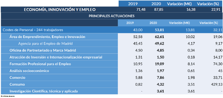 El presupuesto del Área de Gobierno de Economía, Innovación y Empleo asciende a 87,85 millones. Será prioritaria la innovación empresarial, el relanzamiento de Madrid Emprende, la intermediación laboral, los mercados municipales y el comercio.
