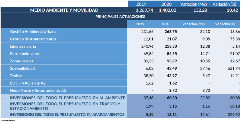 El presupuesto del Área de Gobierno de Medio Ambiente y Movilidad asciende a 1.402,02 millones, cifra que se incrementa un 10 %, y dará cobertura a la nueva Estrategia de Sostenibilidad Ambiental MADRID 360 que entrará en vigor a lo largo de 2020.