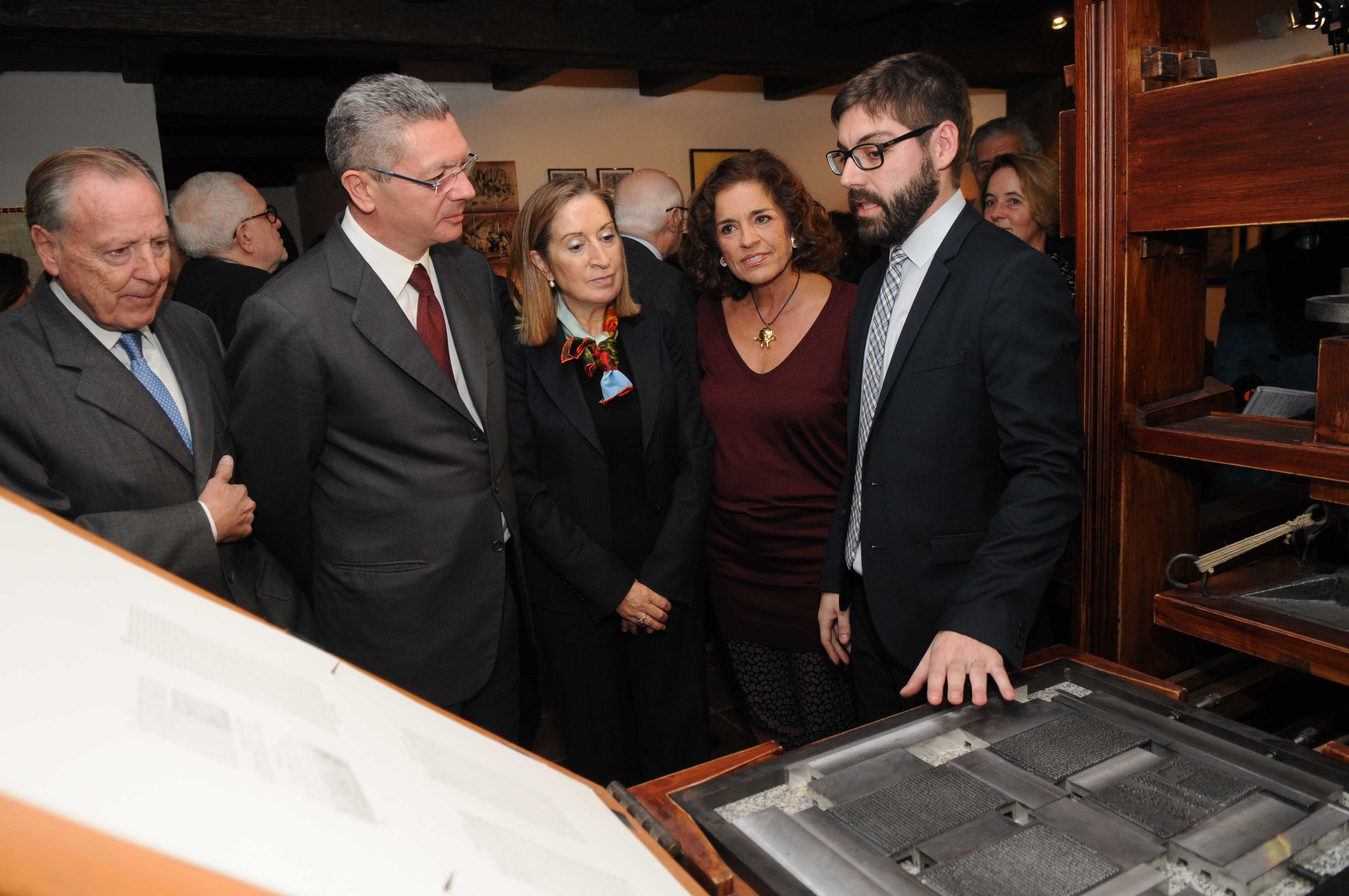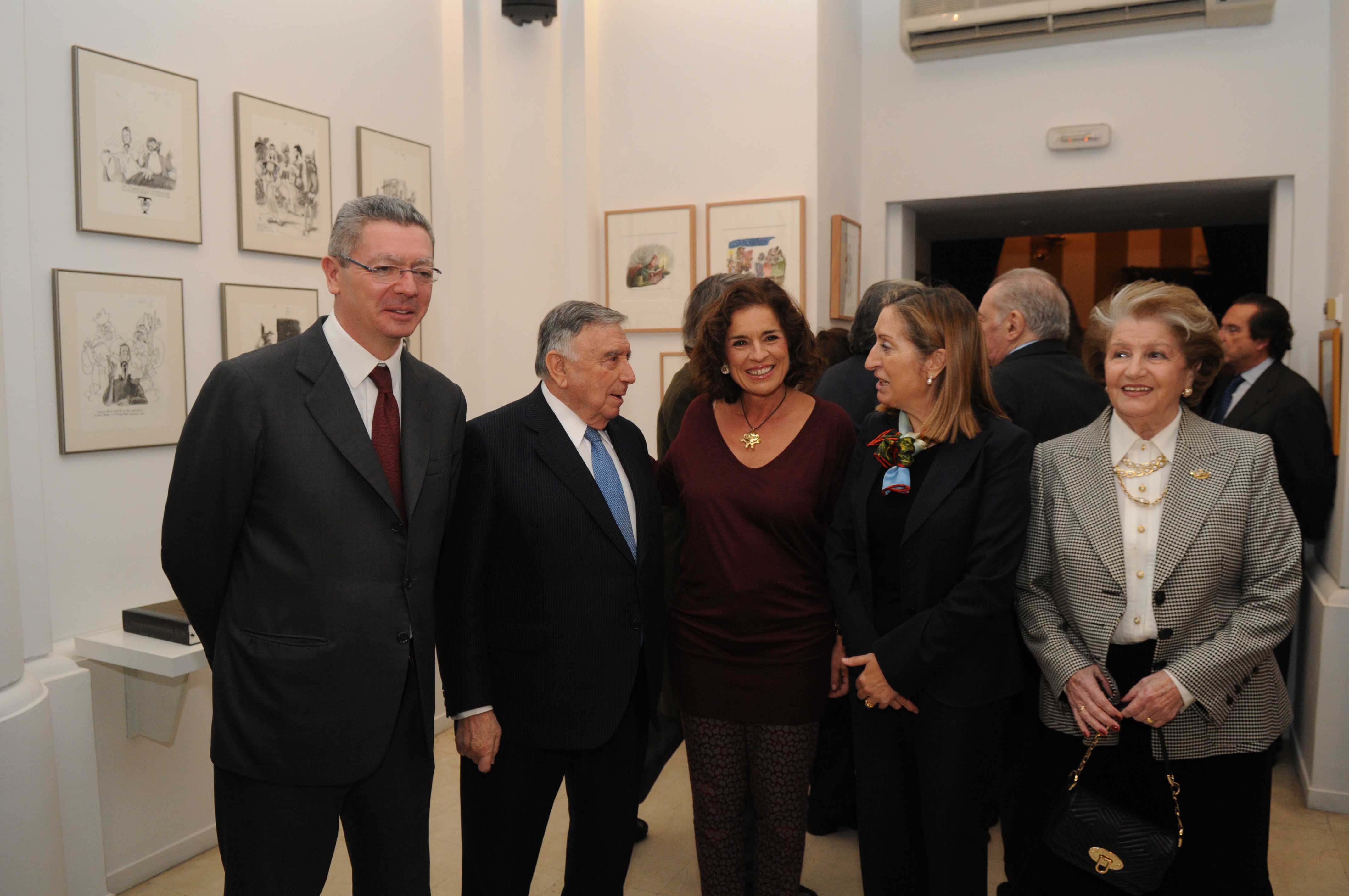 La alcaldesa, junto con el ministro de Justicia, Alberto Ruiz-Gallardón; la ministra de Fomento, Ana Pastor, Luis María Ansón, y la viuda del humorista Isabel Vigiola, en distintos momentos de la inauguración de la muestra.