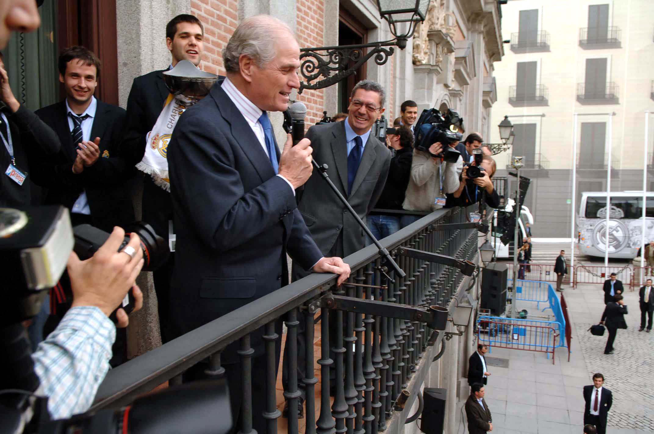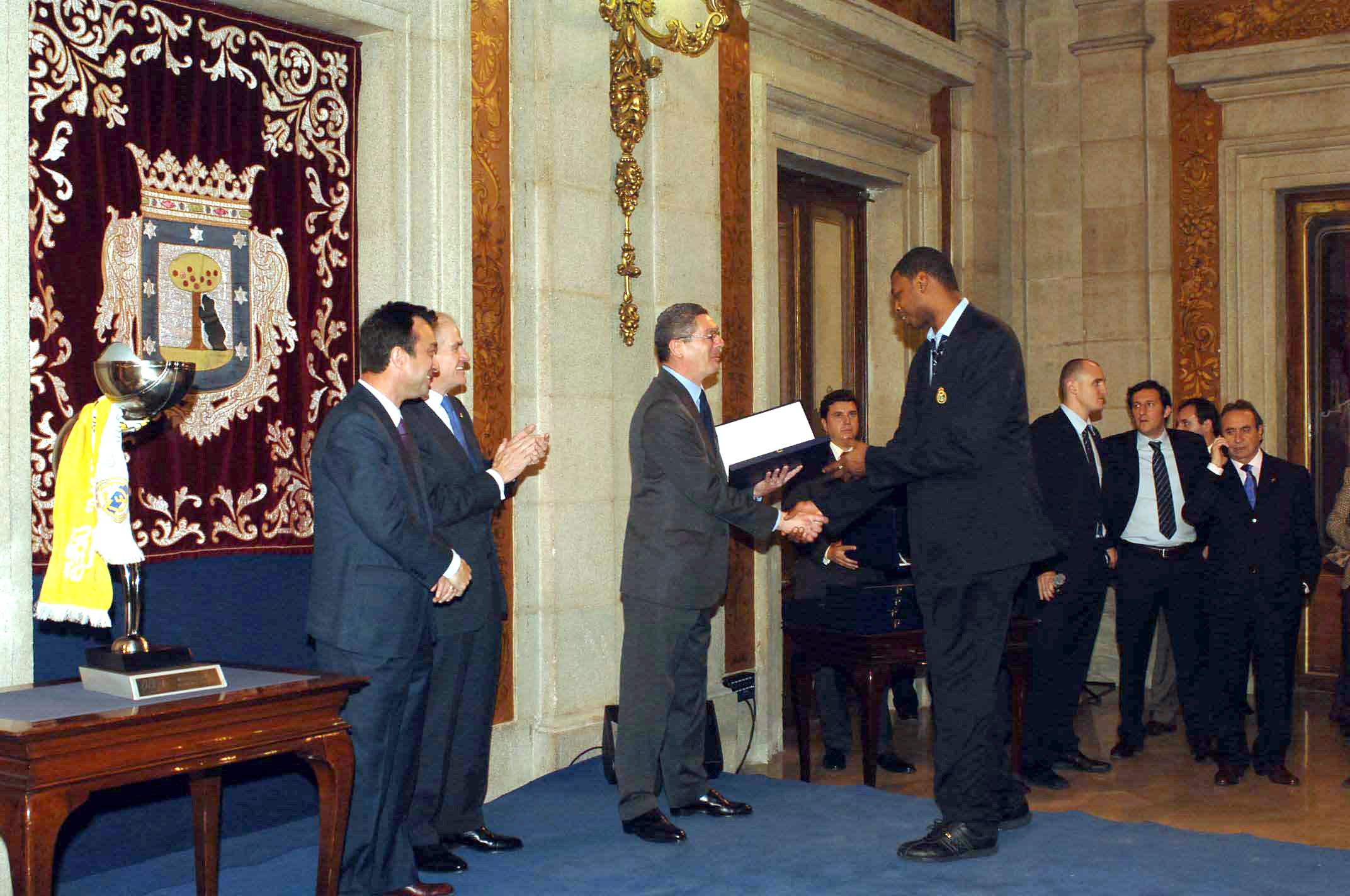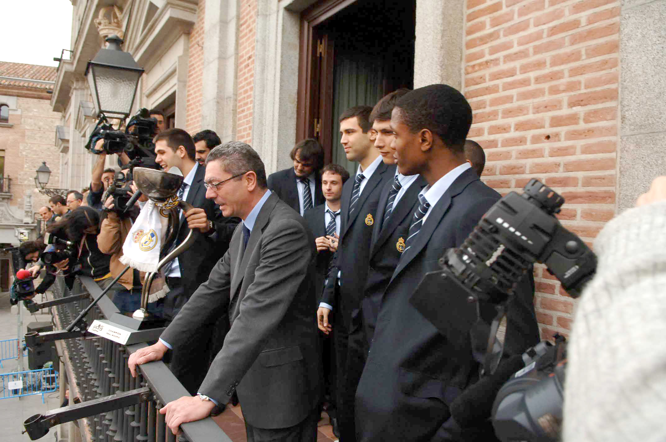 El alcalde de la Ciudad de Madrid, Alberto Ruiz-Gallardón, ha recibido esta tarde, en la sede del Ayuntamiento, al equipo de baloncesto del Real Madrid. Los jugadores han celebrado en la Plaza de la Villa, adonde se han acercado numerosos aficionados, su triunfo en la Copa ULEB, el único trofeo que faltaba en las vitrinas madridistas. Éste es el decimocuarto título europeo del histórico club, que ayer logró frente al Lietuvus Rytas en Charleroi, Bélgica. Esta victoria catapulta al equipo a la próxima Euroliga y lleva al Real Madrid a ocupar el sitio en Europa que le corresponde por calidad e historia.