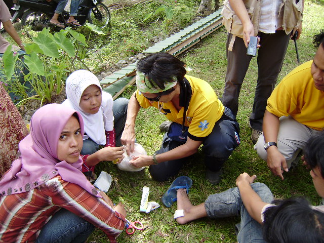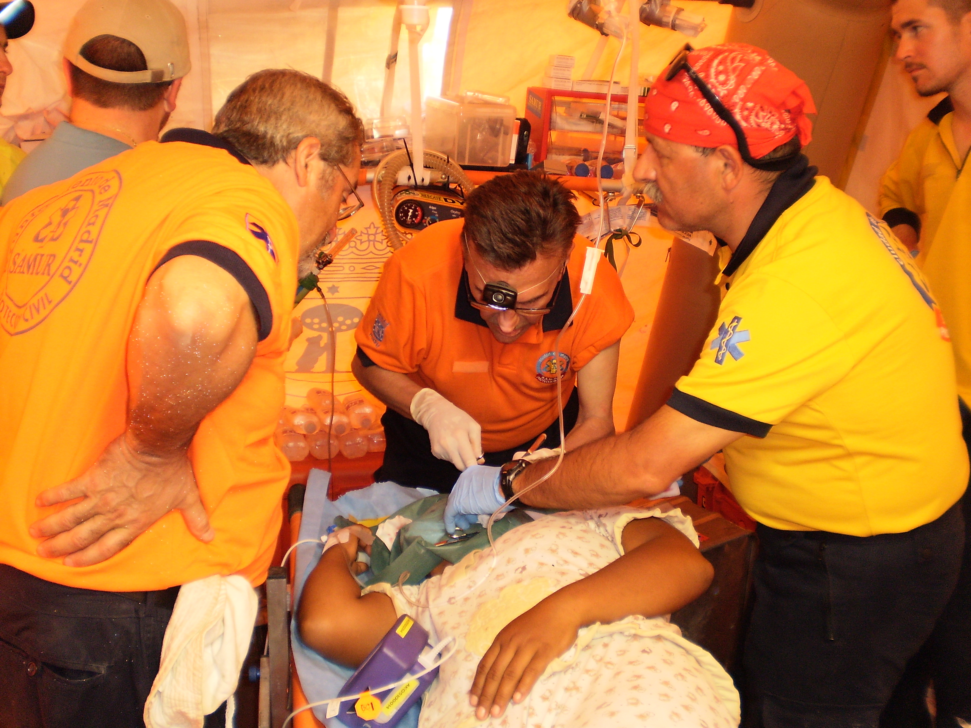 Sanitarios del Samur atienden a la población afectada tras el terremoto de Indonesia en la aldea Parit Malintang, ubicada a unos 20 kilómetros de Pariaman, al norte de la isla de Sumatra. Los miembros del Samur instalaron el Puesto Médico Avanzado frente a un hospital que, tras el seísmo, quedó agrietado y en ruinas. Ahora, en el descampado que ha quedado, los médicos y enfermeros atienden a los heridos que, hasta el momento, no han recibido asistencia sanitaria. Además, en varios vehículos alquilados por la Agencia Española de Cooperación Internacional y convertidos para la ocasión en ambulancias, los sanitarios del Samur, junto con los 8 médicos del antiguo hospital, están recorriendo las pequeñas aldeas para tratar las heridas, fracturas, enfermedades respiratorias, infecciosas y cualquier situación de atención primaria que se les presente. Hasta el momento han atendido a unas 300 personas, la mayoría con heridas, cortes, contusiones, esguinces o tumores no tratados anteriormente.