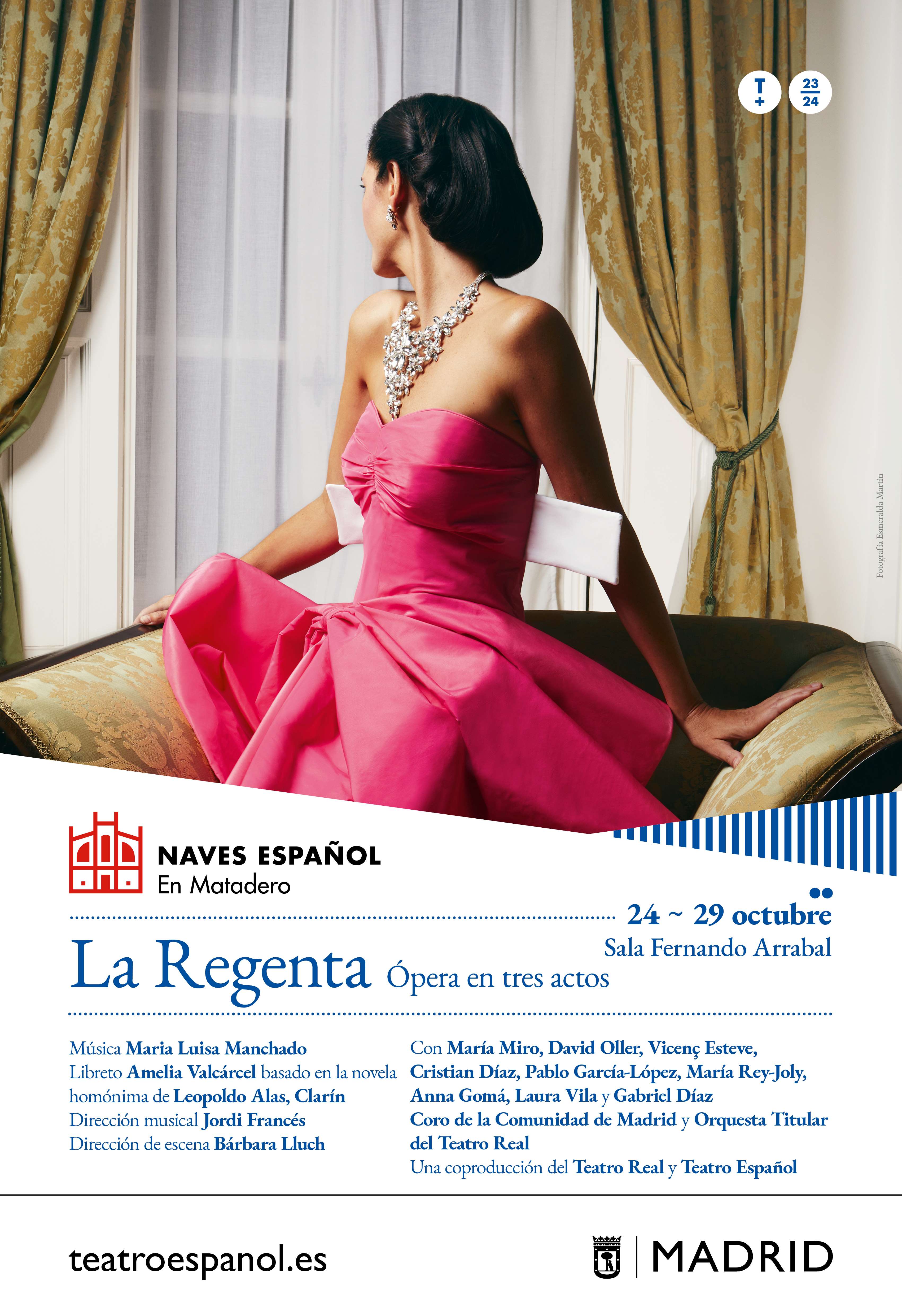 La Regenta es una coproducción del Teatro Real y Teatro Español con música de María Luisa Manchado Torres (1956), libreto de Amelia Valcárcel y Bernaldo de Quirós basado en la novela homónima (1884-1885) de Leopoldo Alas, “Clarín”, dirección musical de Jordi Francés y dirección de escena de Bárbara Lluch, interpretada por María Miro, David Oller, Vicenç Esteve, Cristian Díaz, Pablo García-López, María Rey-Joly, Anna Gomá, Laura Vila y Gabriel Díaz, con Andrés Bernal y Magdalena Aizpurua como figurantes, con diseño de espacio escénico e iluminación de Urs Schönebaum, diseño de vestuario de Clara Peluffo, edición musical de Guillermo Buendía, dirección del coro de Josep Vila i Casañas, con el Coro de la Comunidad de Madrid y la Orquesta Titular del Teatro Real. /