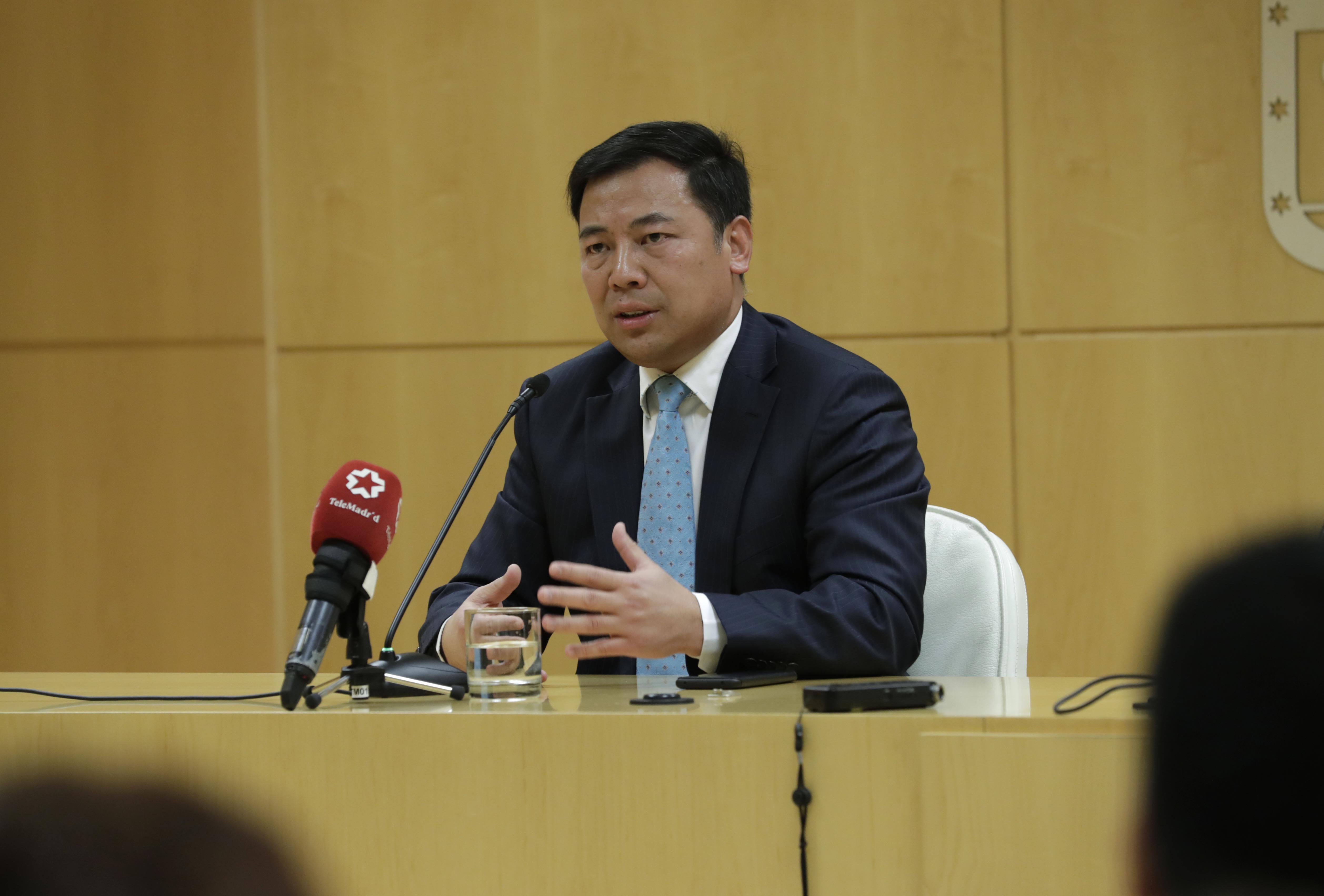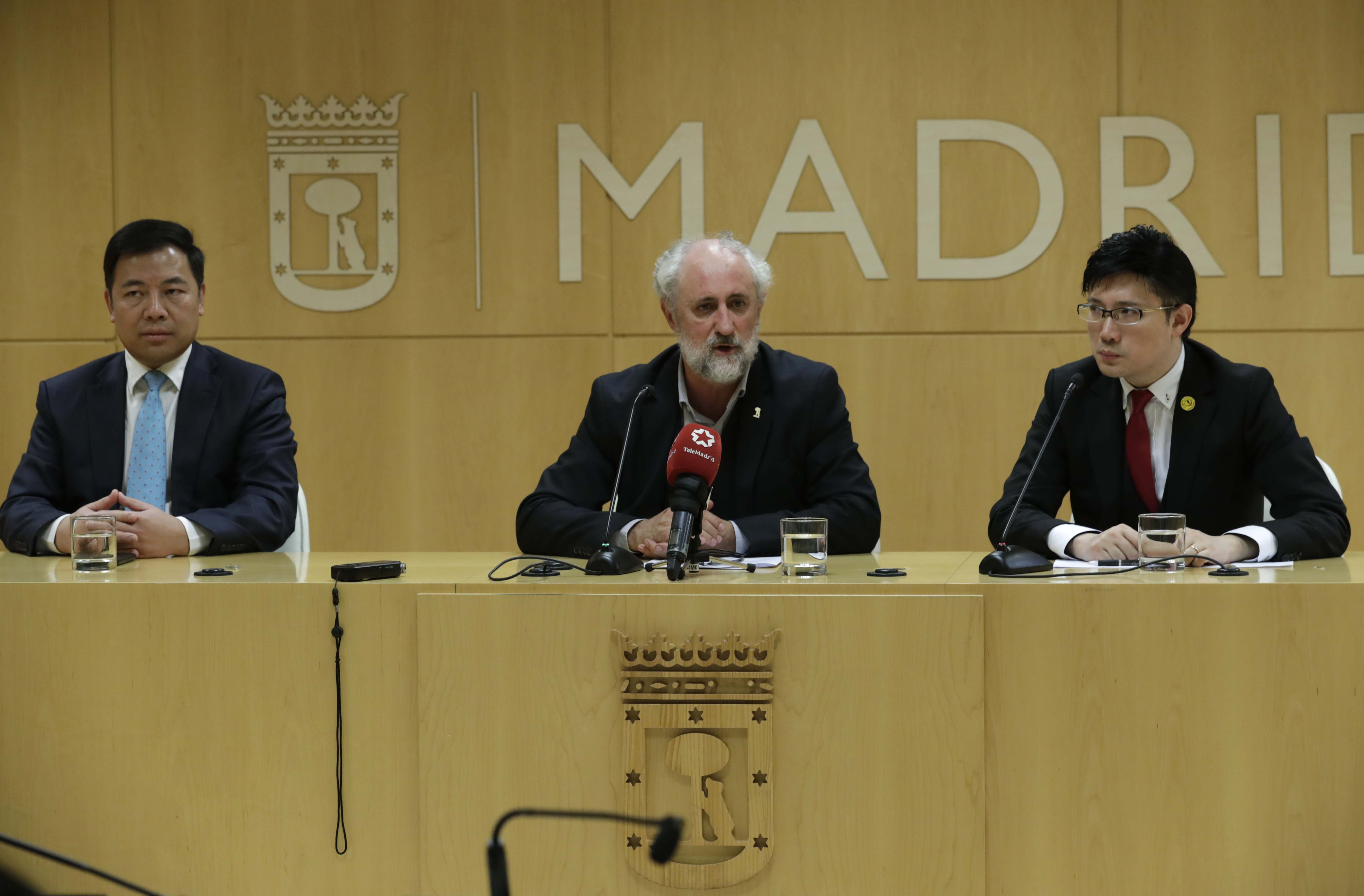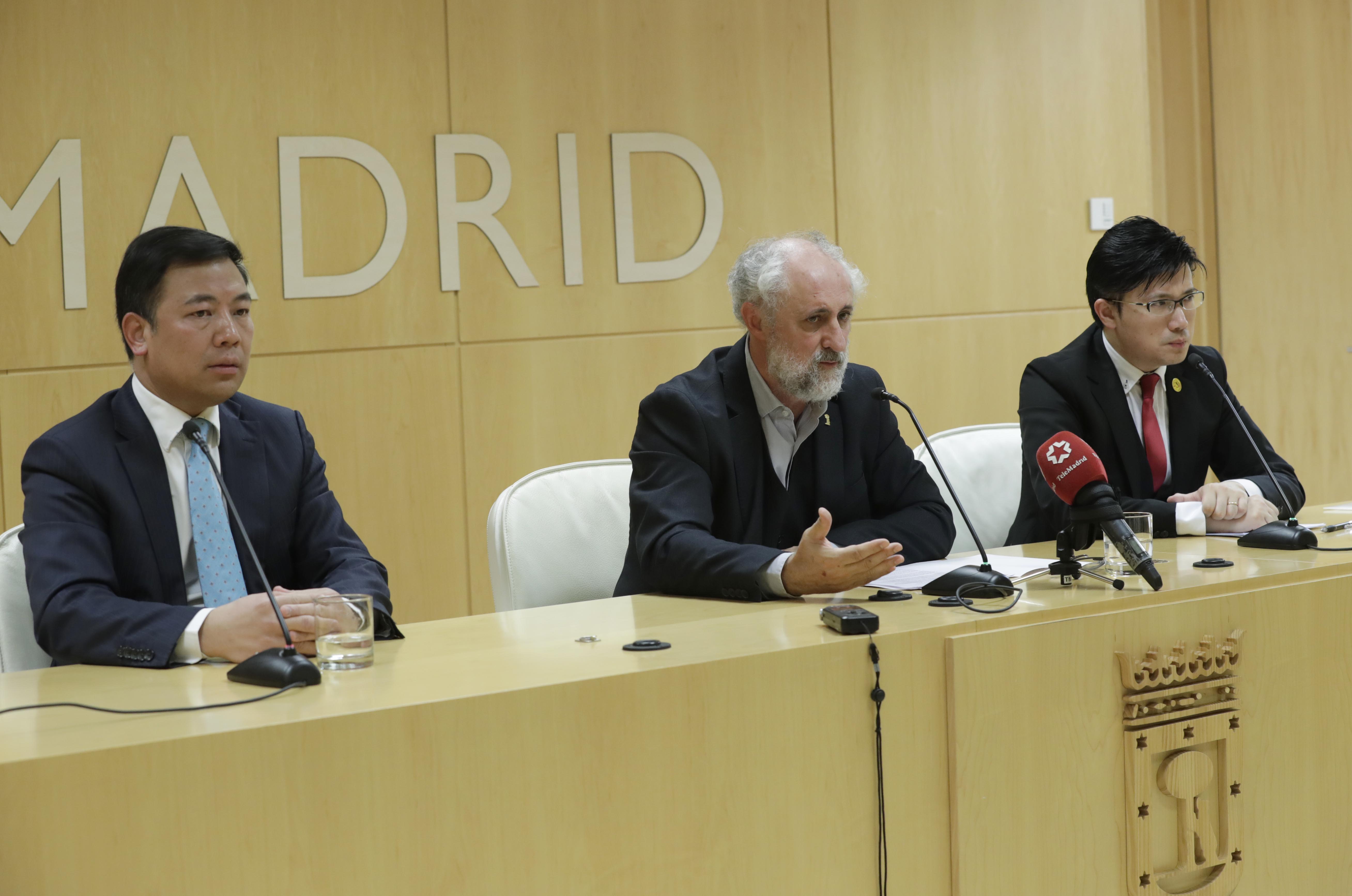 El coordinador general de Alcaldía, Luis Cueto, acompañado por el presidente de la Fundación para el Intercambio entre Yiwu y España, Mao Wenjin, y por el presidente del Overseas Chinese Service Center en Madrid, Mao Feng, ha presentado la Semana del Tren Madrid-Yiwu que va a tener lugar entre el 18 y el 25 de noviembre. Se trata de una semana cuyo objetivo es promocionar y dar a conocer el tren de mercancías que cubre los 13.000 kilómetros de distancia entre su origen en la ciudad comercial china de Yiwu, situada en la costa del Pacífico a 300 kilómetros al sur de Shanghái, y Madrid.