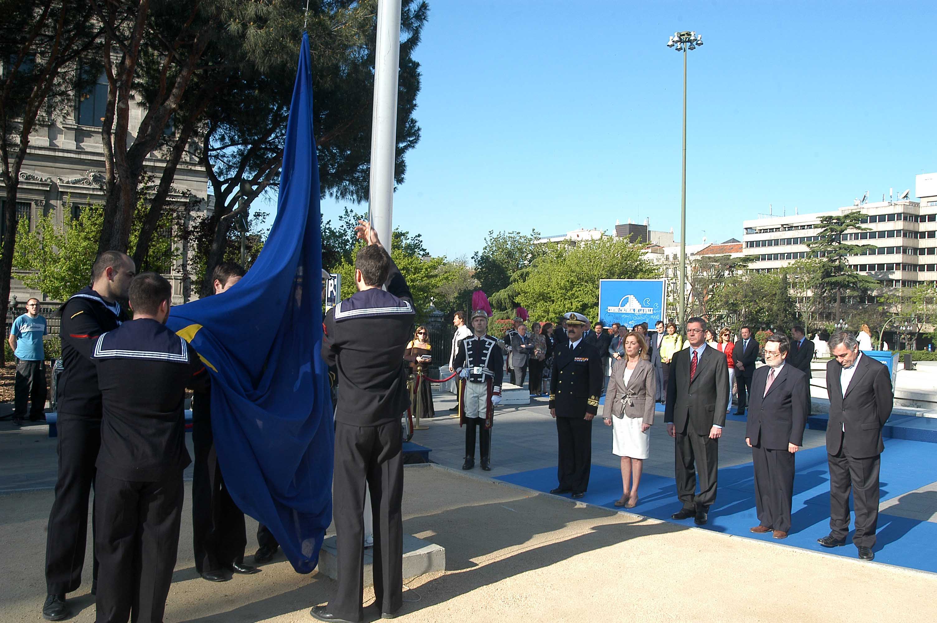 El alcalde de Madrid, Alberto Ruiz-Gallardón, ha presidido esta mañana el acto de izado de la bandera europa con motivo de la celebración del Día de Europa y que se ha celebrado en los Jardines del Descubrimiento de la Plaza de Colón.