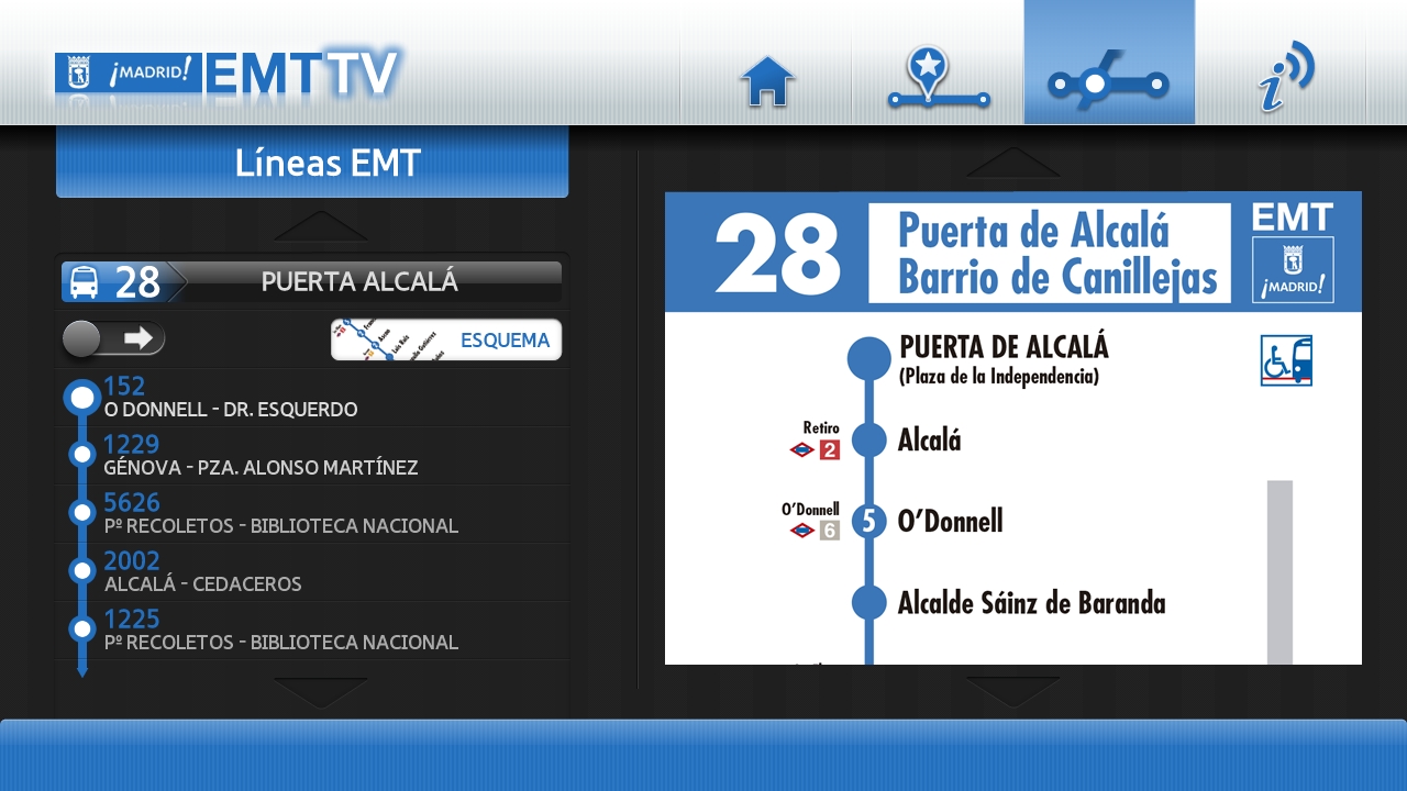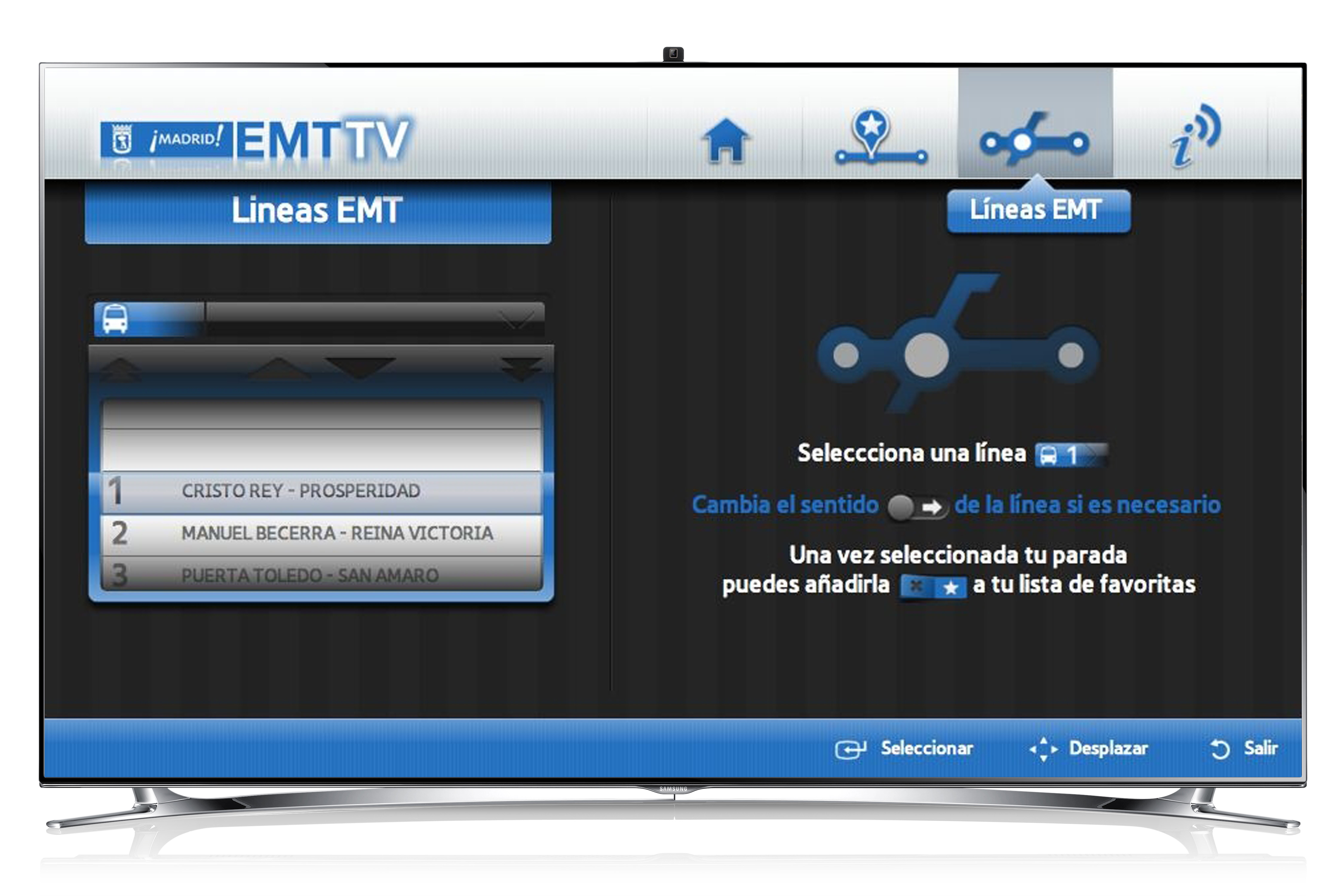 La información sobre el servicio y la red de líneas de la EMT, que ya está presente, gracias a las nuevas tecnologías, en muchos ámbitos de los usuarios se introduce ahora en el salón de su casa. Hasta ahora, se podía encontrar información en la calle, en las paradas, en el interior de los autobuses a través de pantallas informativas, en cualquier lugar y a cualquier hora gracias a los dispositivos móviles y Smartphones, en su puesto de trabajo, mediante la página web de la empresa. Ahora, gracias al desarrollo conjunto del área tecnológica de la EMT y Samsung, líder en tecnología de convergencia, la información llega a la televisión de casa, mediante la aplicación Samsung SmartTV.