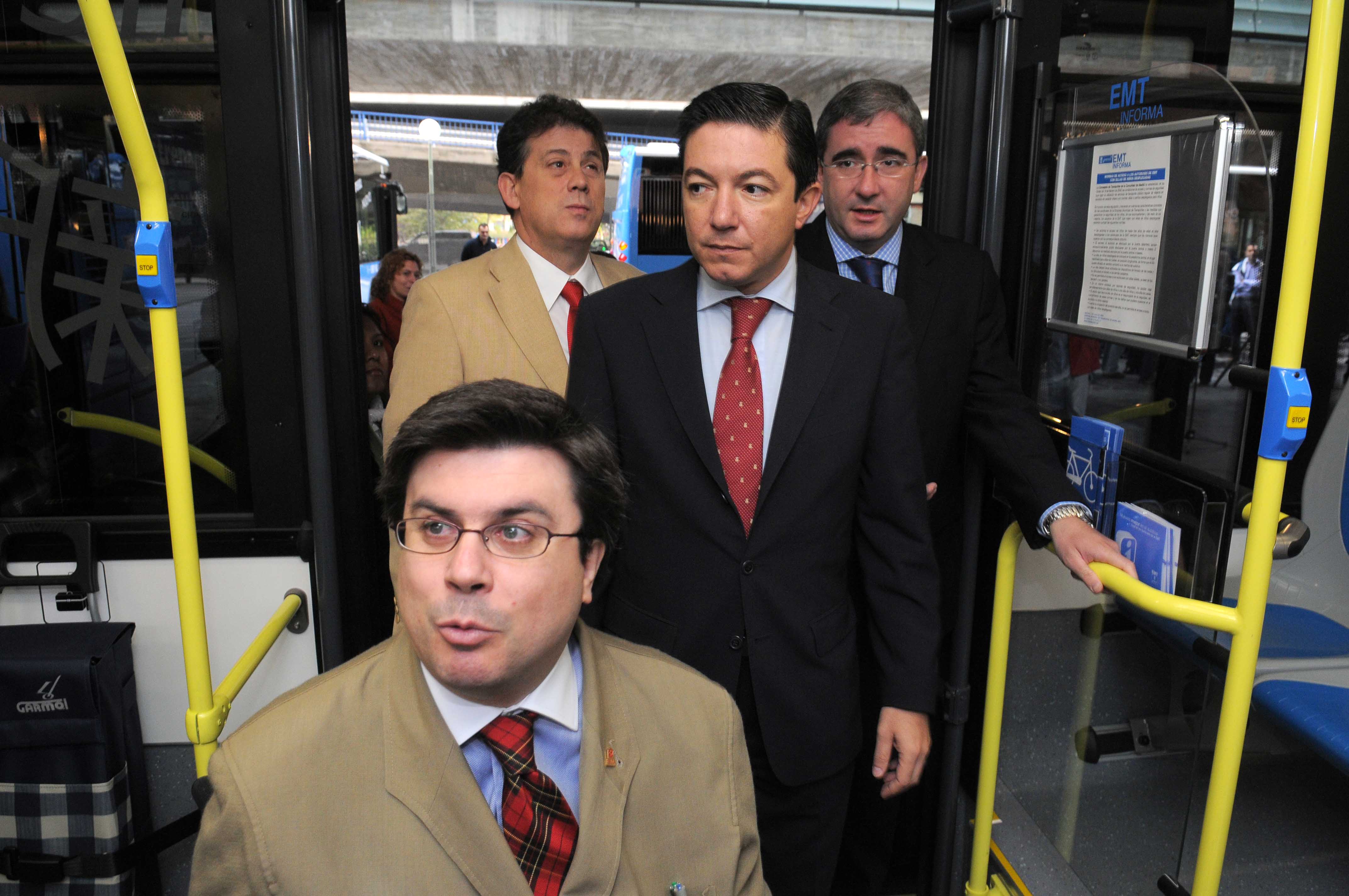 El delegado de Movilidad, Pedro Calvo, durante la presentación de los nuevos interiores de la EMT