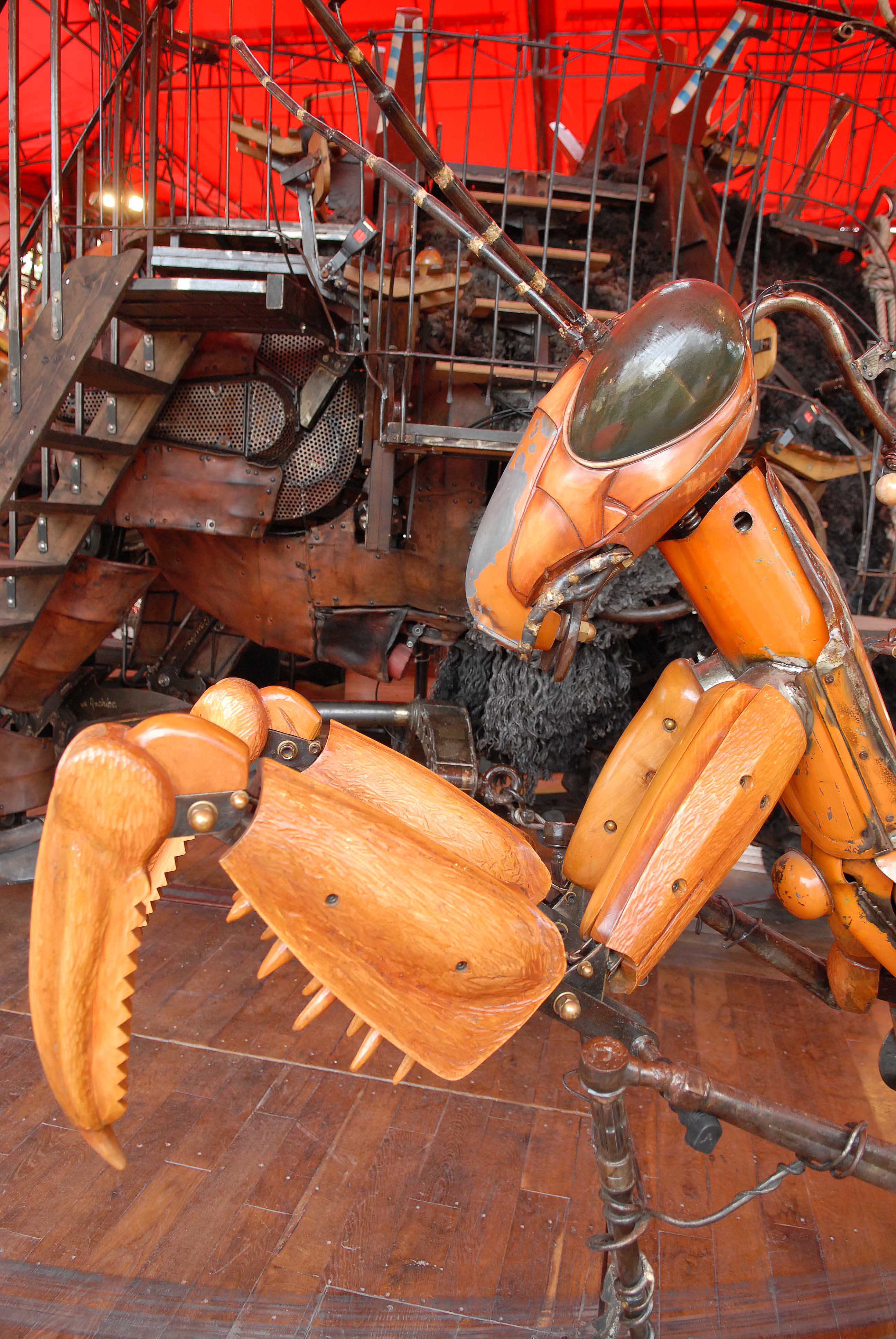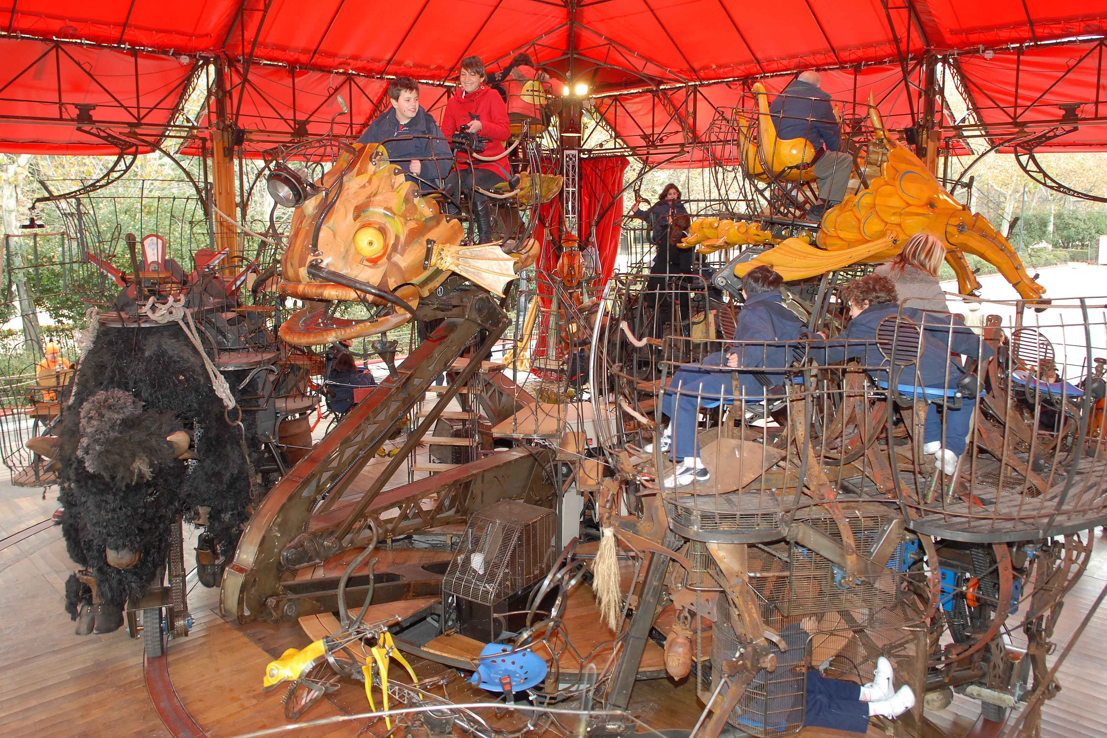 El público accede a la estructura a través de tres escaleras. Los búfalos gigantes, ubicados en el centro de la atracción, actúan poniendo en movimiento la plataforma central, mientras las cabezas de pez se elevan hasta el corazón del armazón, sobre brazos articulados. Mientras, los insectos trepadores circulan en un rail periférico, situado en los postes de las esquinas, y comienzan su ascensión aleteando hacia el techo del carrusel.