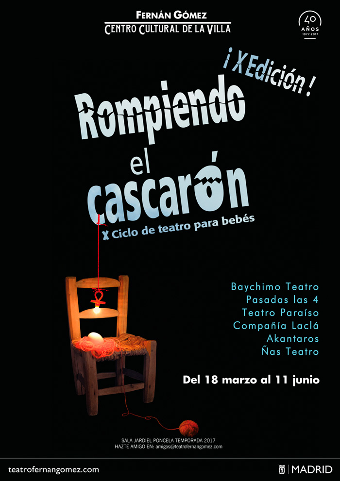 El ciclo de teatro para bebes: Rompiendo el cascarón cumple este año su décimo aniversario en el escenario de la Sala Jardiel Poncela del Fernán Gómez. Centro Cultural de la Villa. Entre los siete espectáculos diferentes que se podrán ver del 18 de marzo al 11 de junio, el Fernán Gómez quiere homenajear, por su reconocida trayectoria en esta disciplina teatral, a la compañía Teatro Paraíso con la programación de dos de sus mejores propuestas.