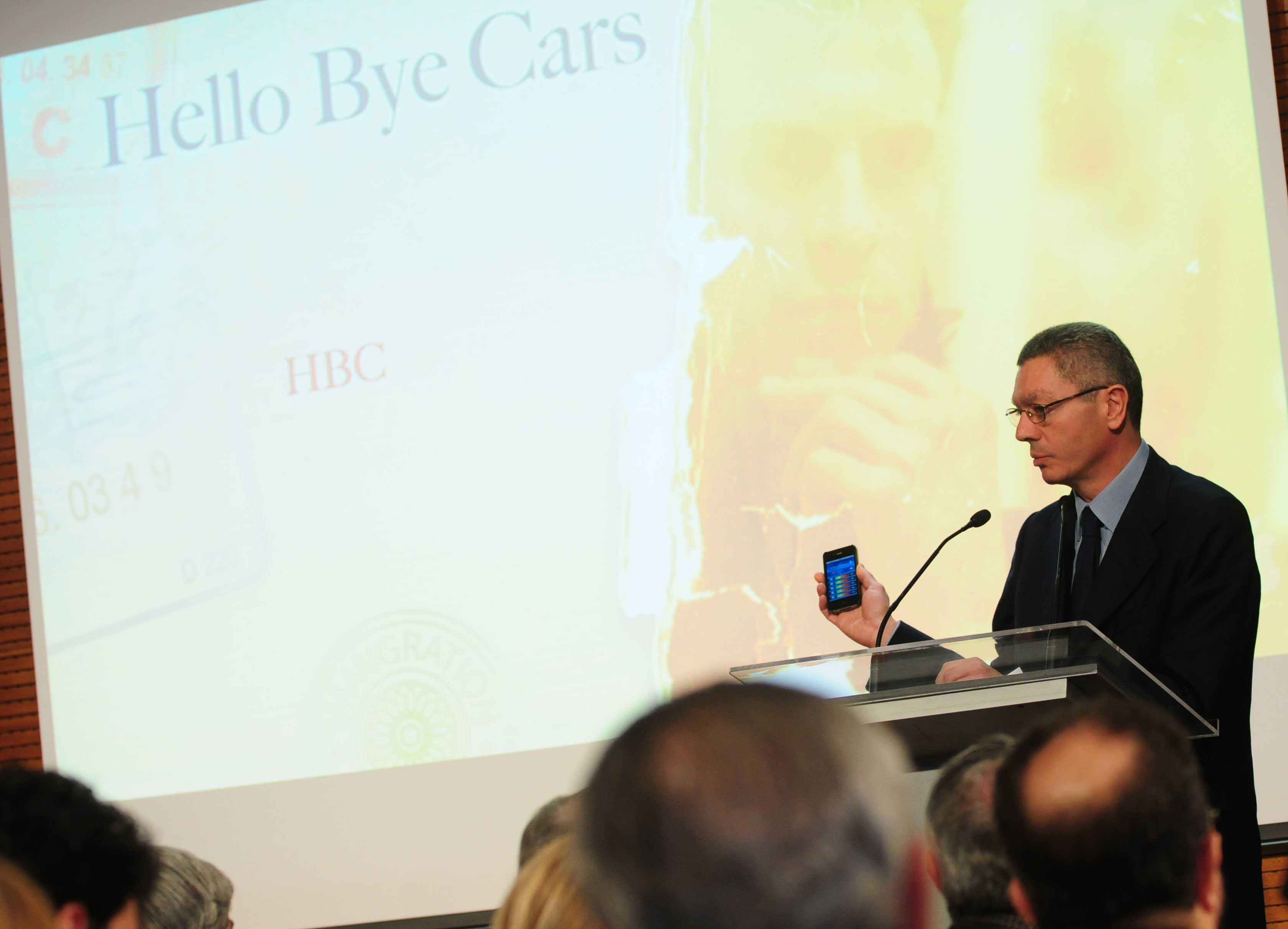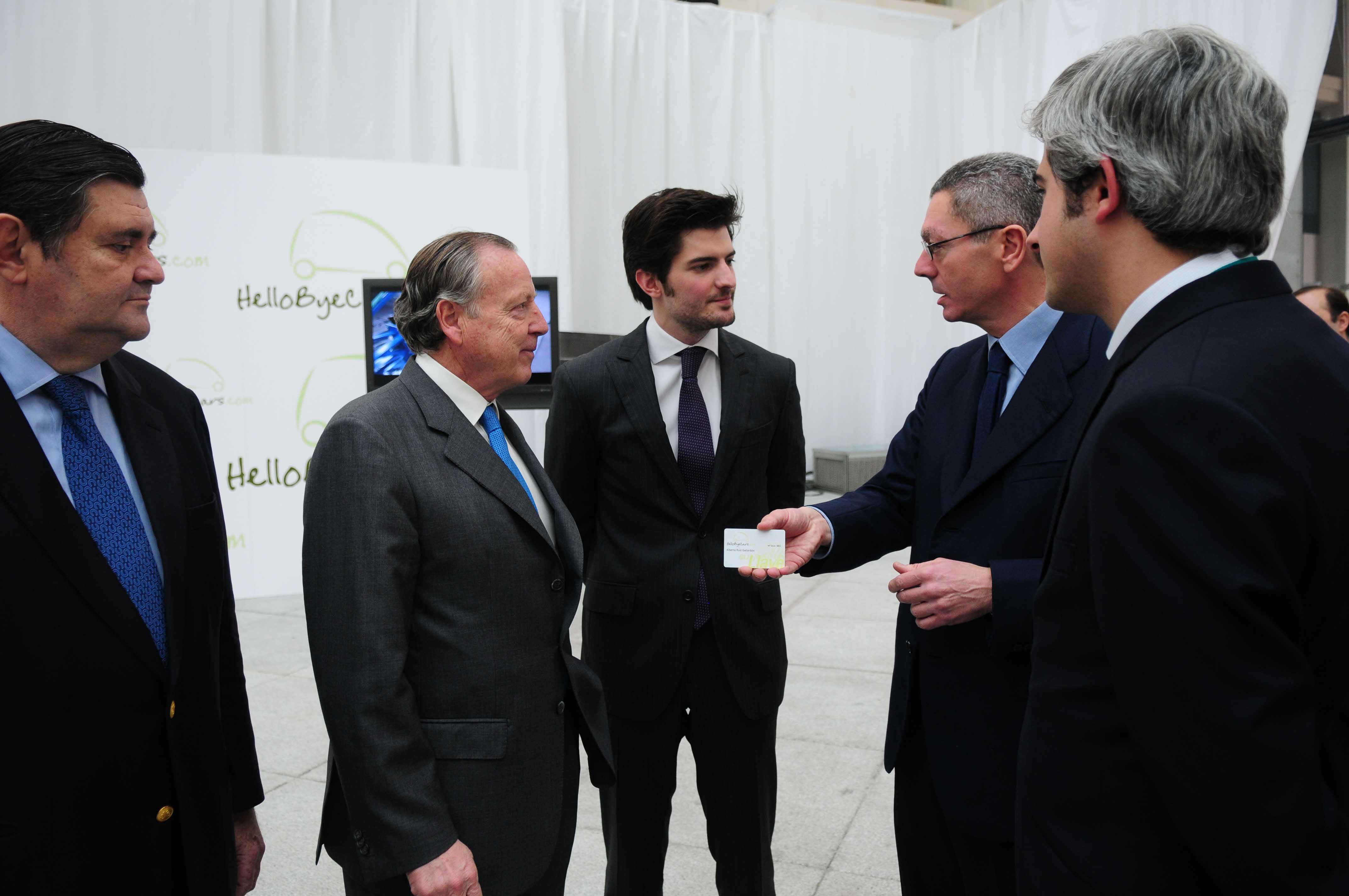 Imágenes de la presentación de la iniciativa HelloByeCars, una empresa de alquiler de coches eléctricos para moverse de manera sostenible por la ciudad. El alcalde, Alberto Ruiz-Gallardón, ha expresado el apoyo del Ayuntamiento a esta apuesta y ha recordado que es el primer alcalde de España que utiliza para sus desplazamientos un vehículo eléctrico. El acto, al que han asistido el ex alcalde, José María Álvarez del Manzano, el delegado de Movilidad, Pedro Calvo, y los responsables de la nueva empresa, se ha celebrado en el Palacio de Cibeles.
