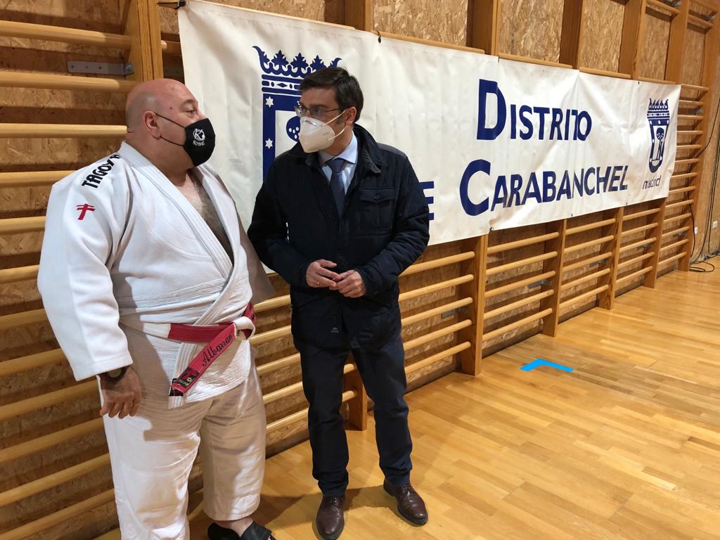 El concejal de Carabanchel, Álvaro González, ha visitado hoy el Centro Deportivo Municipal La Mina, donde ha presenciado un entrenamiento de esta disciplina y el desarrollo de una clase infantil con motivo del Día Mundial del Judo, además de interesarse por el protocolo sanitario que se sigue en el centro para prevenir la COVID-19.